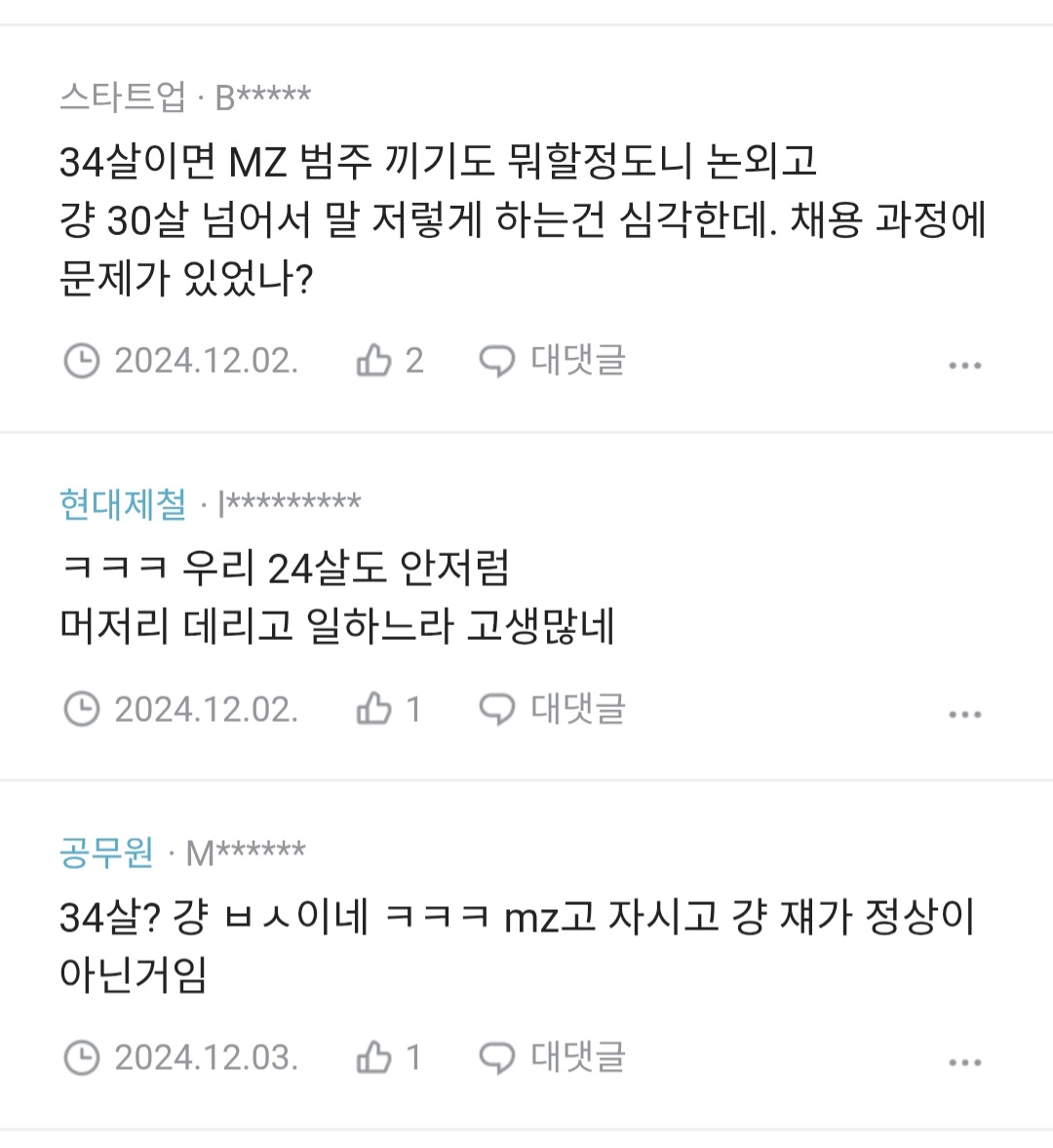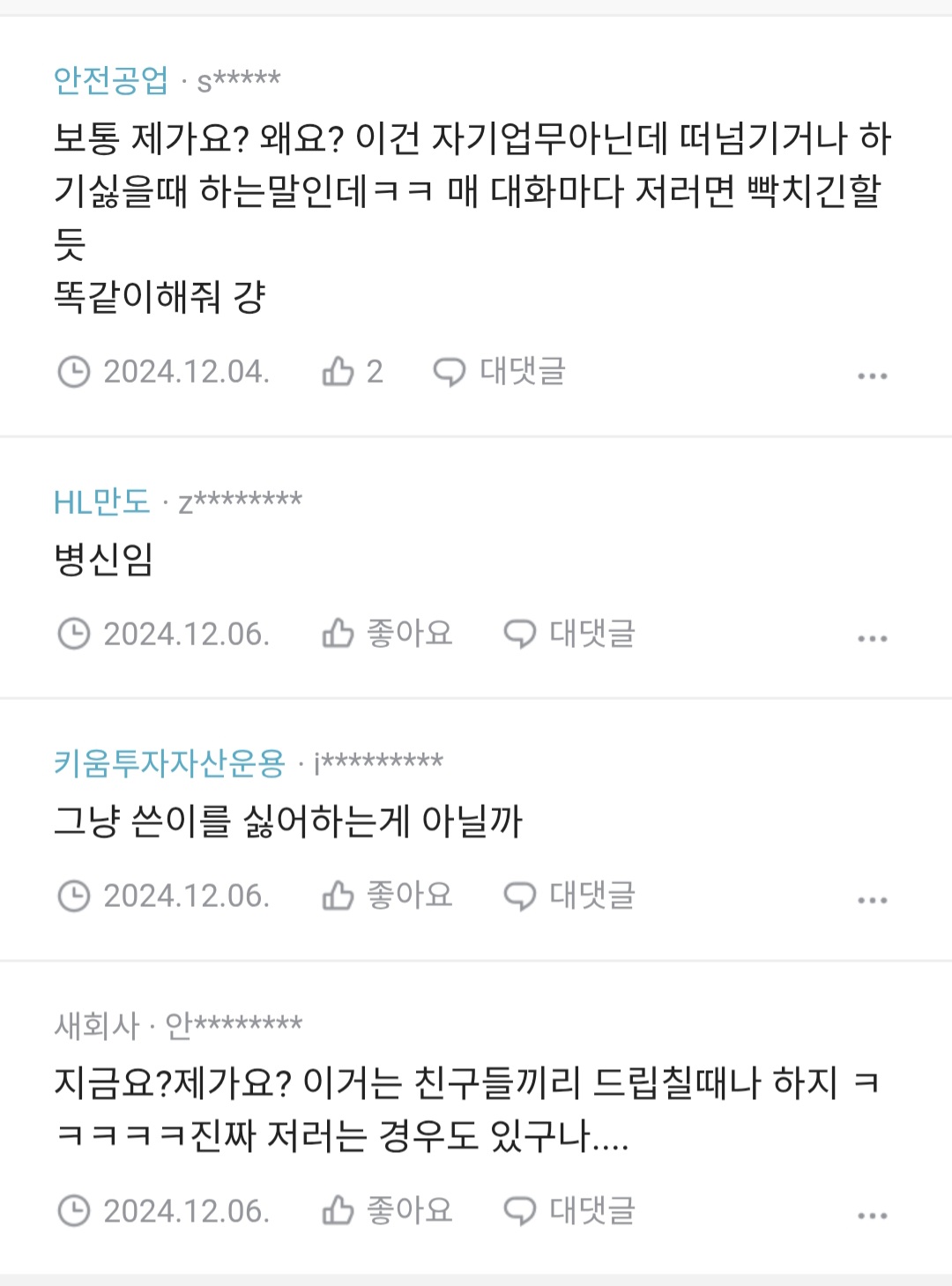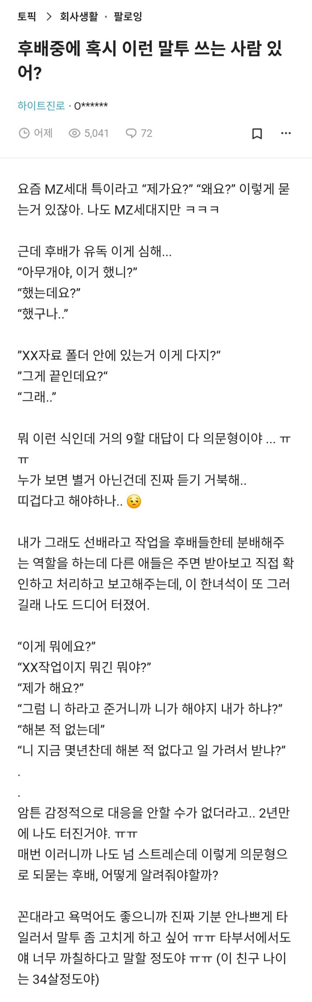 [흥미돋]회사 후배중에 혹시 이런 말투 쓰는 사람 있어? 작성자악귀|작성시간25.01.20|조회수11,597 목록 댓글 25 글자크기 작게가 글자크기 크게가 출처: https://www.teamblind.com/kr/post/후배중에-혹시-이런-말투-쓰는-사람-있어-KHpeAKaH 다음검색 현재 게시글 추가 기능 열기 북마크 공유하기 신고 센터로 신고 댓글 댓글 25 댓글쓰기 답글쓰기 댓글 리스트 작성자쌍계피지떡 | 작성시간 25.01.20 그냥 싸가지없는거같은데... 작성자으므르이스 | 작성시간 25.01.20 싸가지없엌 작성자대 아니고 데 | 작성시간 25.01.20 34살이 저러는거면 엠지가 아니라 그냥 쟤가.. 작성자AUDREY NUNA | 작성시간 25.01.20 저걸 지적하면 또 .. 저는 그런뜻으로 한 말 아닌데요? 이러면서 나를 예민충 취급하는데 개빡쳐 하…. 작성자요거트는핑계고 | 작성시간 25.01.20 백퍼 남자네 댓글 전체보기
