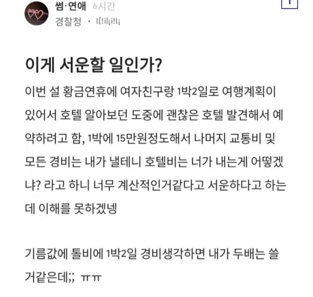 [기타]여친한테 호텔비 다 내라했는데 안내 작성자ㅂㄹㄴㅌ|작성시간25.01.21|조회수17,610 목록 댓글 44 글자크기 작게가 글자크기 크게가 출처: 여성시대 (ㅂㄹㄴㅌ)기름 값은 여행 안가도 어차피 넣어야 되는거고. 남자는 15만원보다 낮게 나올거 같은데김치남이 여자 등처먹으려 하네넘 반반하고 싶어서 발광하는게 보여서 계산적! 다음검색 현재 게시글 추가 기능 열기 북마크 공유하기 신고 센터로 신고 댓글 댓글 44 댓글쓰기 답글쓰기 댓글 리스트 작성자용인곰쥬 | 작성시간 25.01.21 기름값에 톨비 존나게 드나보네~~~ 작성자포루잔모리 | 작성시간 25.01.21 설연휴에 15만원짜리 방을 괜찮은방이라고 하는거부터 평소에 얼마나 가성비로 데이트했을지 그려짐 작성자돈빌려주지말기 | 작성시간 25.01.22 내가왜 작성자냥르장머리 | 작성시간 25.01.22 ㅈㄴ 짜친다 작성자I wish you love | 작성시간 25.01.22 의사표현만 하면 죠가 아닌가...? 저래도 안 헤어지니까 죠가 나오지... 댓글 전체보기