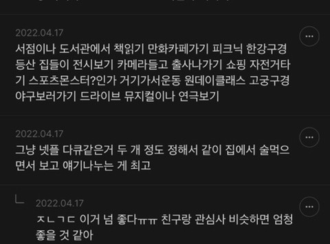체험낚시, 루지, 레이싱, 양봉체험, 딸기농장, 온천욕, 클레이사격체험, 뮤지컬, 공연(티켓구하기 쉬운 가수 일단 가보기), 집꾸미기(셀프도배, 나무가구만들기), 별투어