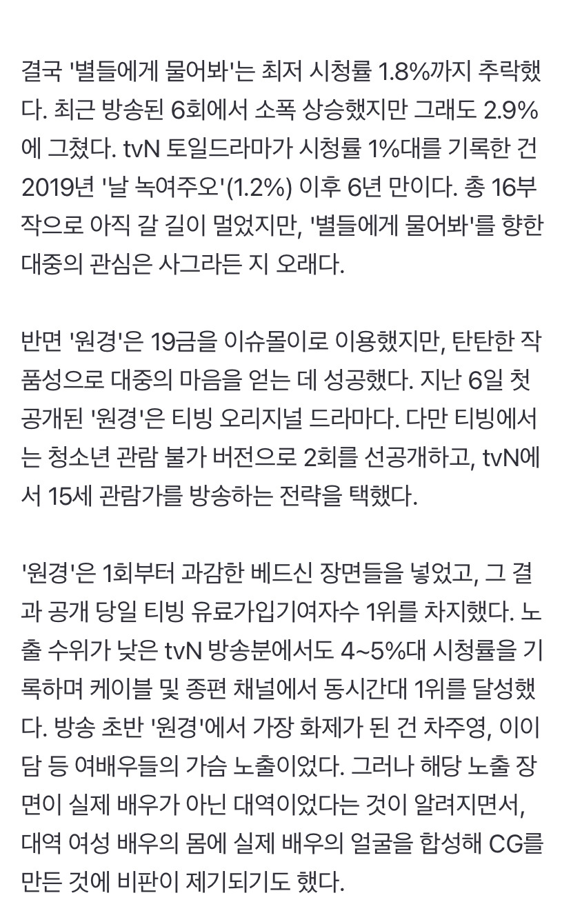 작성자얍얍휴 작성시간 25.01.23 원경 노출씬없었어도 잘됐을텐데ㅠㅠ너무 노출에 포커스가맞춰진느낌 ㅠㅠ