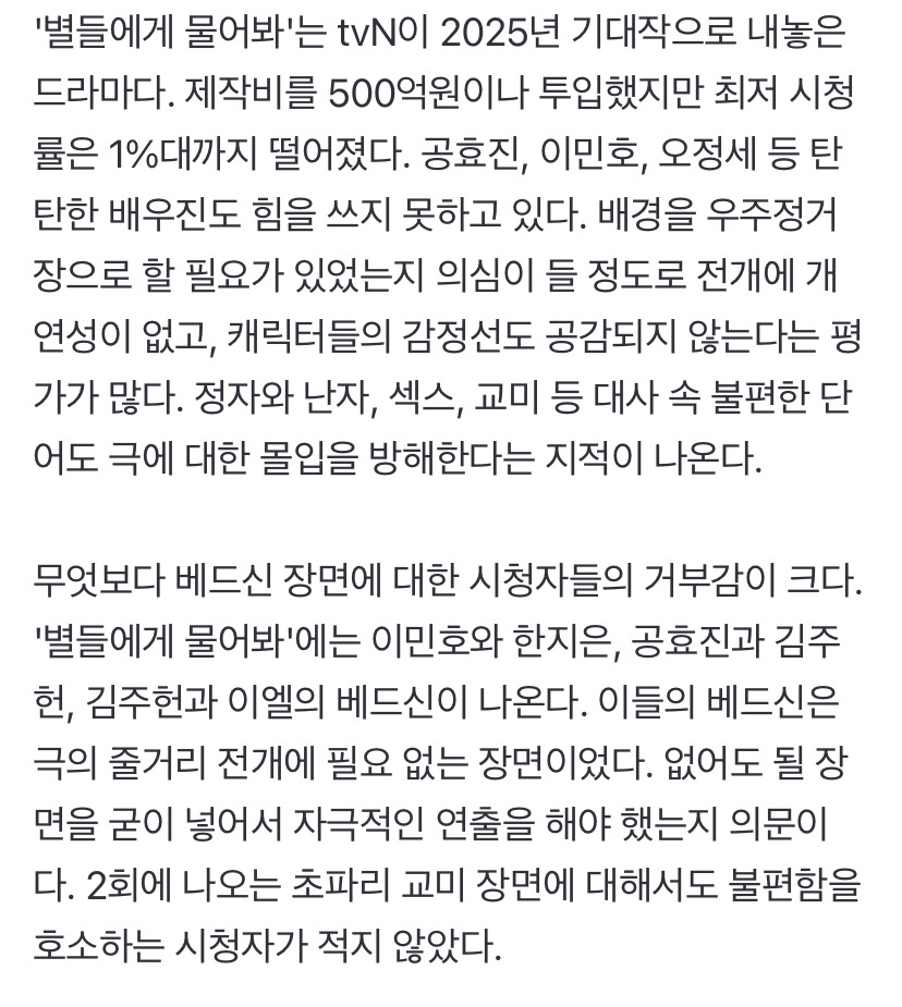 작성자이토록평범한미래 작성시간 25.01.23 sf물 좋아하는데 별들에게 물어봐는 이 기사만 봐도 보고싶은 생각이 싹 사라지네