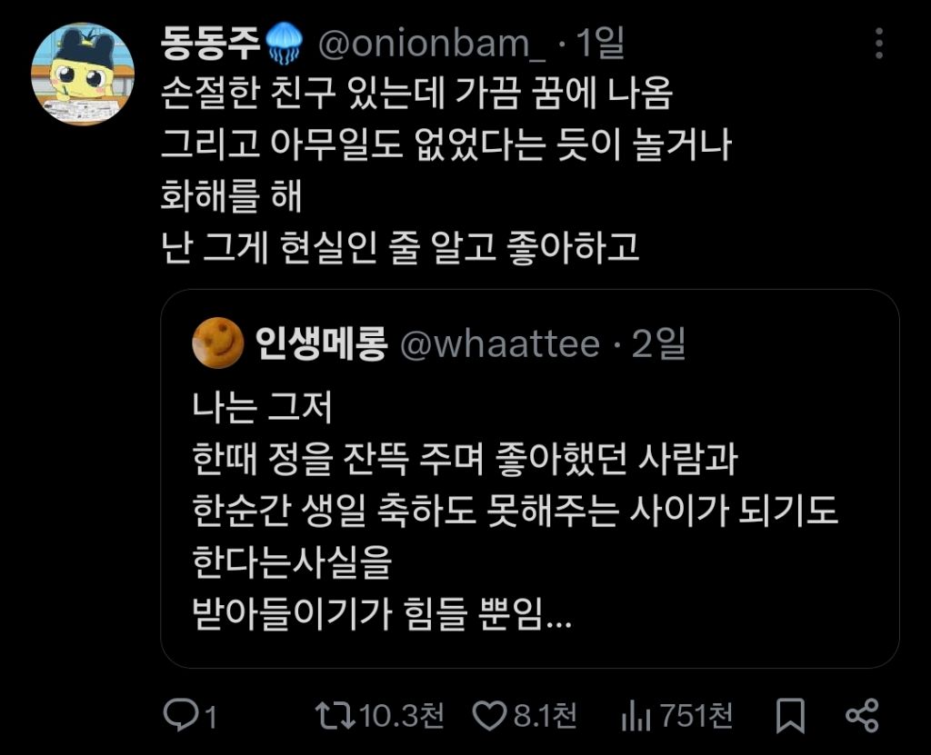 [스크랩] [흥미돋]손절한 친구 꿈에 나올 때 있어? 작성자징징징|작성시간25.01.24|조회수23,681 목록 댓글 91 글자크기 작게가 글자크기 크게가 출처: 여성시대 (본인 닉네임)https://x.com/onionbam_/status/1877733206126158094?t=o2wqg4Rj8RGfucixi_zgbg&s=19X의 동동주🪼님(@onionbam_)손절한 친구 있는데 가끔 꿈에 나옴 그리고 아무일도 없었다는 듯이 놀거나 화해를 해 난 그게 현실인 줄 알고 좋아하고x.com 다음검색 스크랩 원문 : *여성시대* 차분한 20대들의 알흠다운 공간 현재 게시글 추가 기능 열기 북마크 공유하기 신고 센터로 신고 댓글 댓글 91 댓글쓰기 답글쓰기 댓글 리스트 작성자파워J | 작성시간 25.01.24 잊을만하면 꿈에 나와... 작성자돌아뿌리버럭시아스 | 작성시간 25.01.24 후 작성자응원하고있어 | 작성시간 25.01.24 한번 있는데 기분 개좆같았음 작성자열시십분 | 작성시간 25.01.25 나... 내가 그런데 걔는 안그리워할 거 너무 잘 알아서 ㅜ ㅜ몇번 연락해볼까 하다가도 접음 작성자국요환 | 작성시간 25.01.25 오 ㄴㄴ 댓글 전체보기