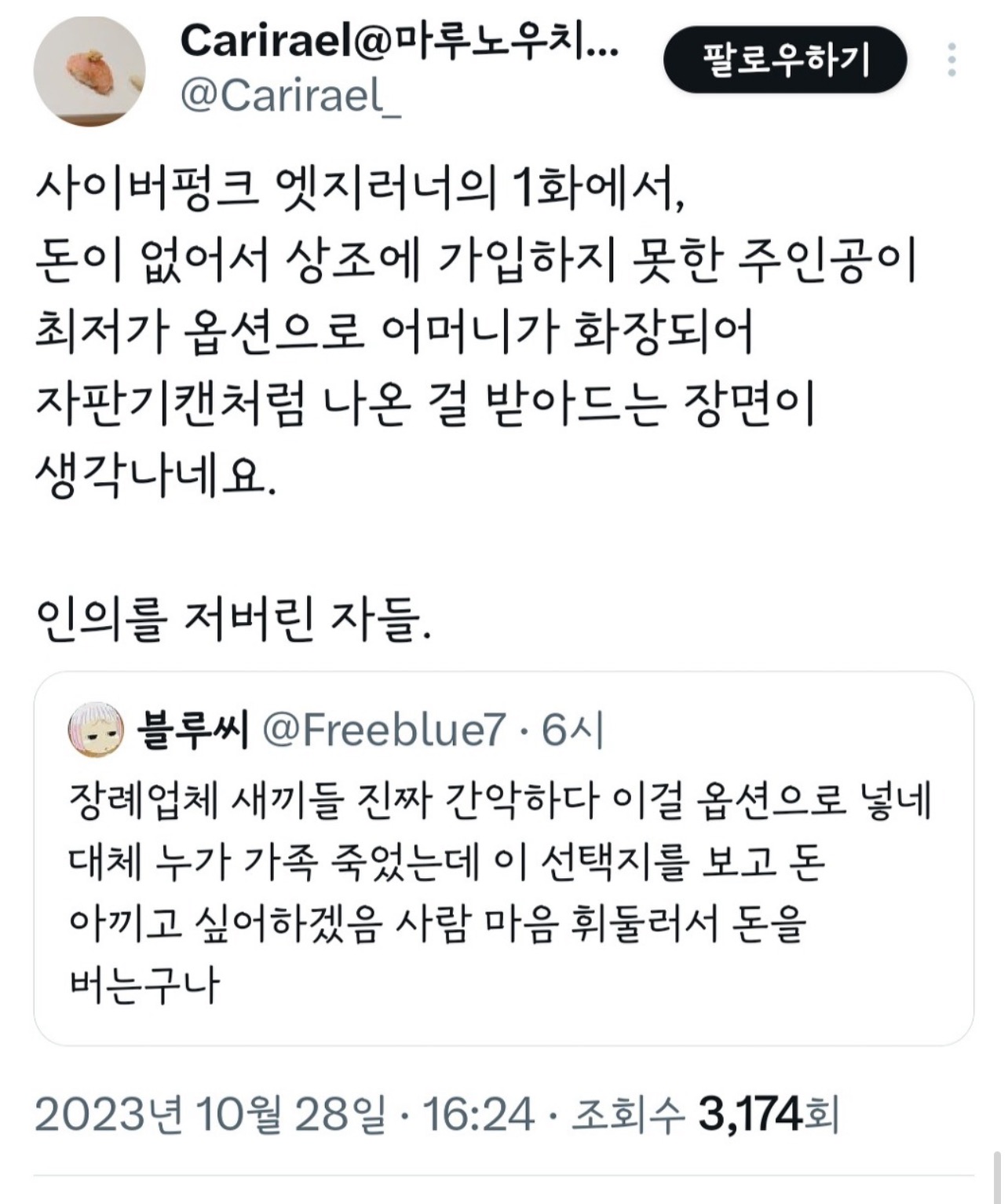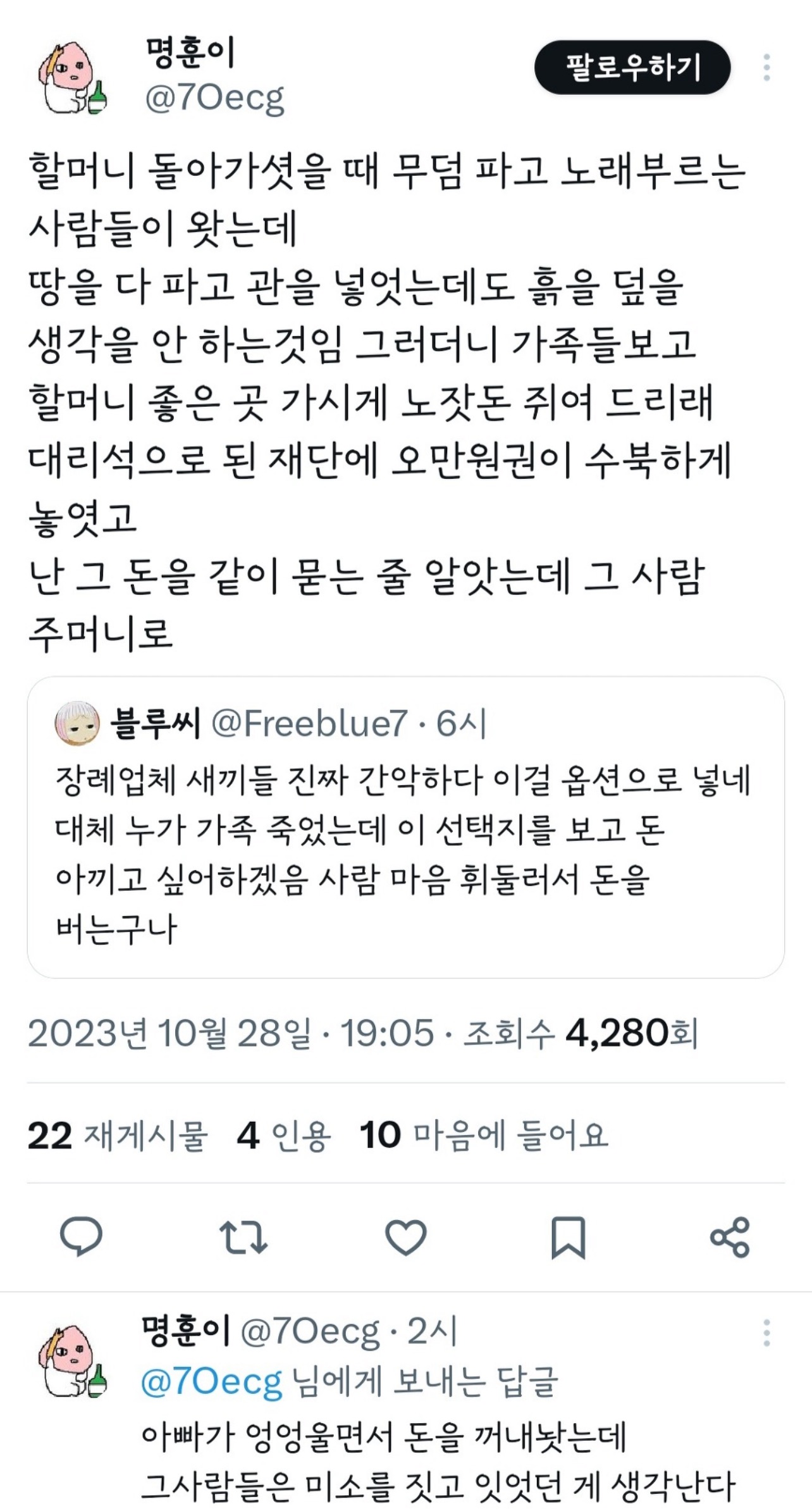 답댓글 작성자스우파그여자못잊어모니카 작성시간 25.01.27 아 기독교장례는 노잣돈 안해? 그건 좋다..