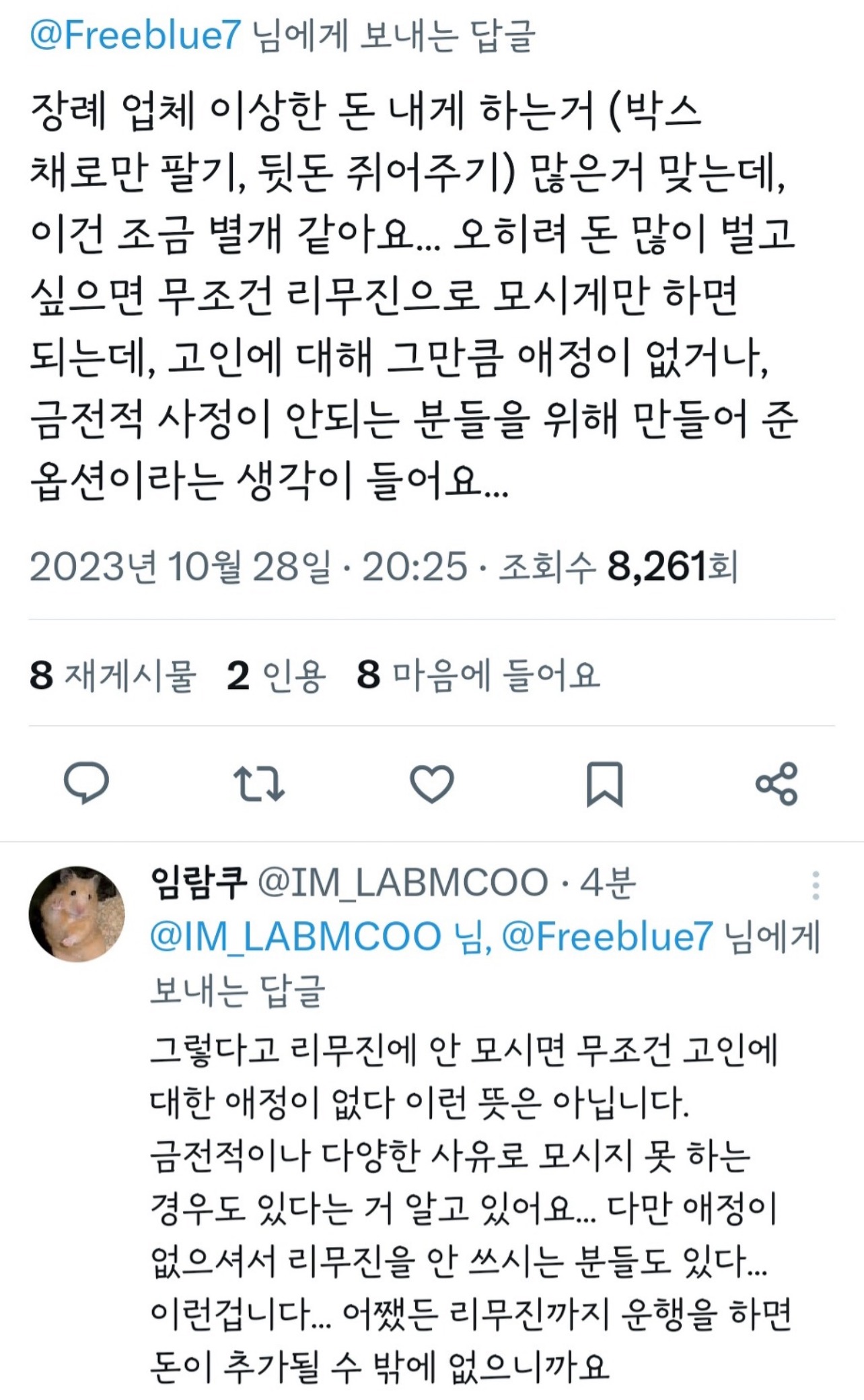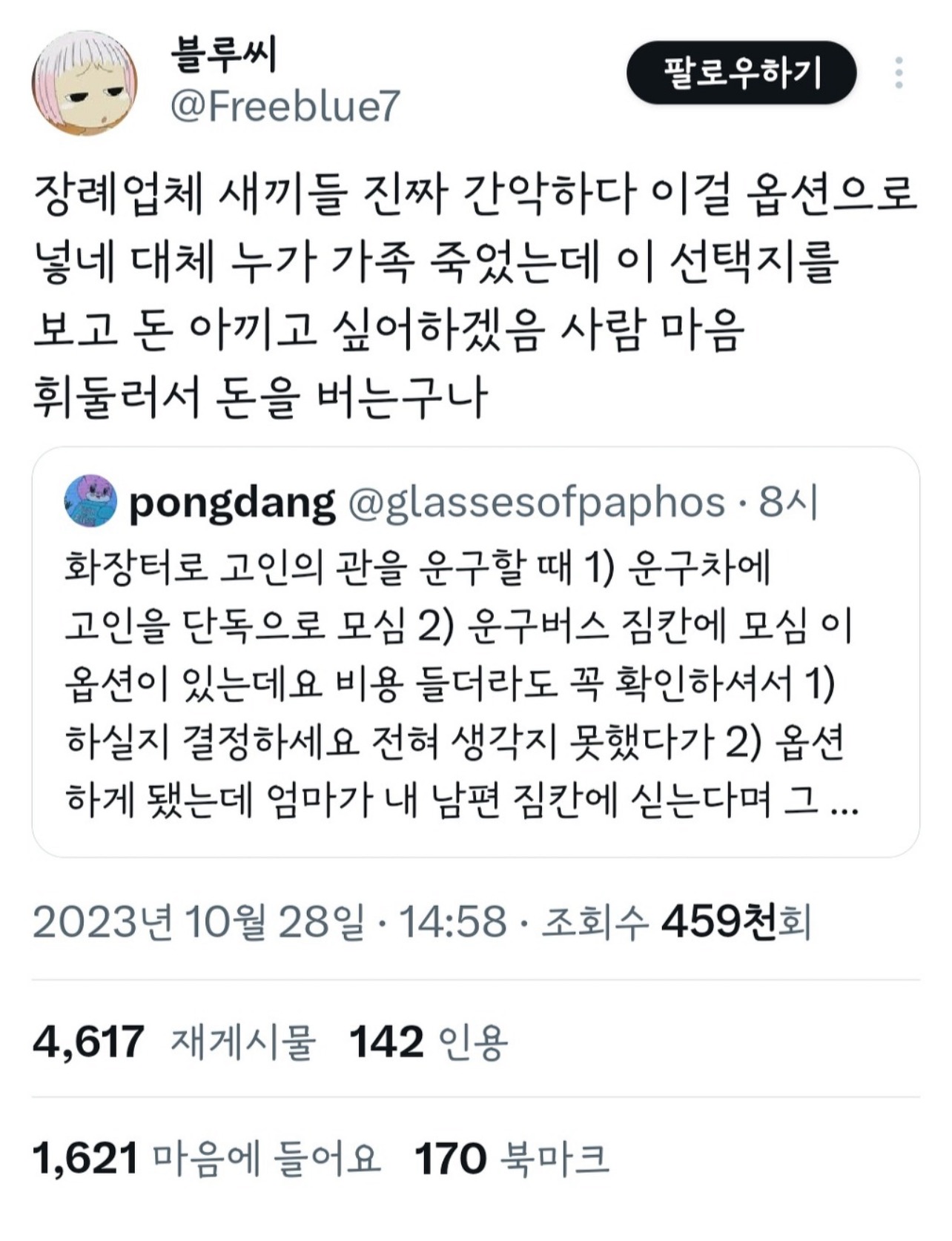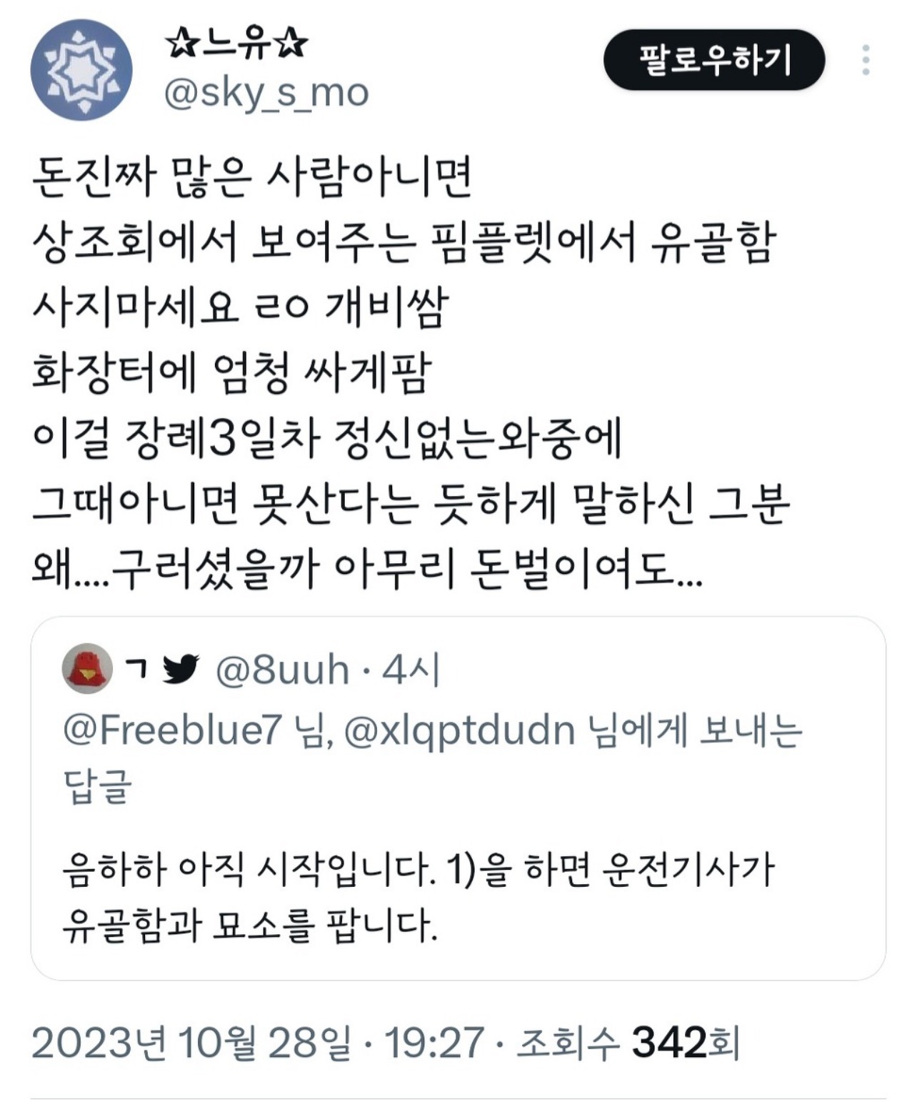 작성자파란물결파도 작성시간 25.01.31 유골함 안산다니까 화내더라 ㅋㅋ
