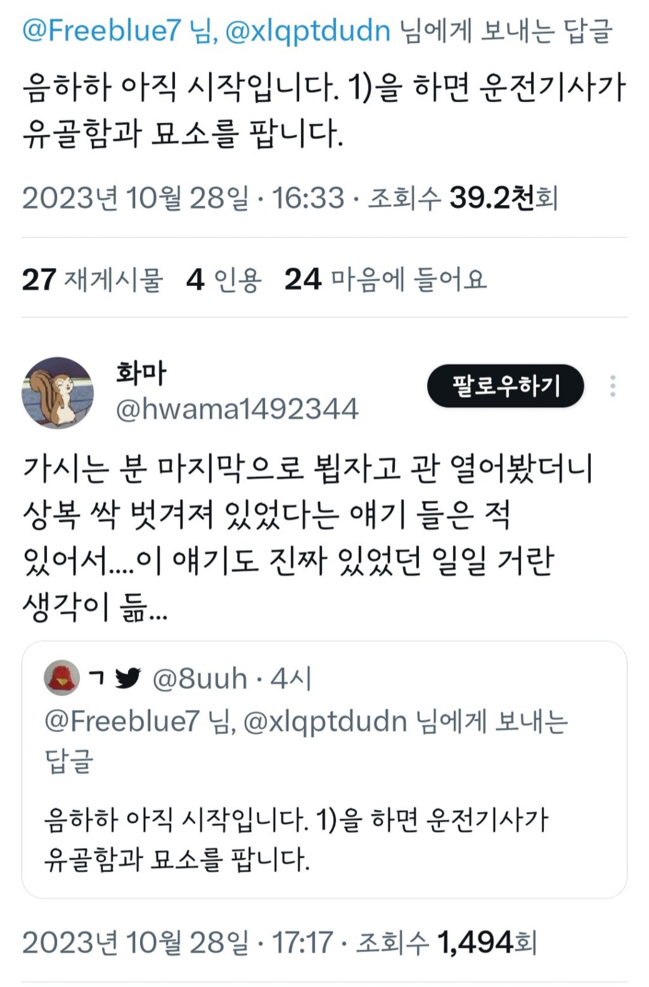 작성자스우파그여자못잊어모니카 작성시간 25.01.27 노잣돈을 왜 가져가는거??? 다른거 차치하고 무섭지도 않나;;; 그리고 노잣돈 원래 가짜돈같은거 올리지 않아?
