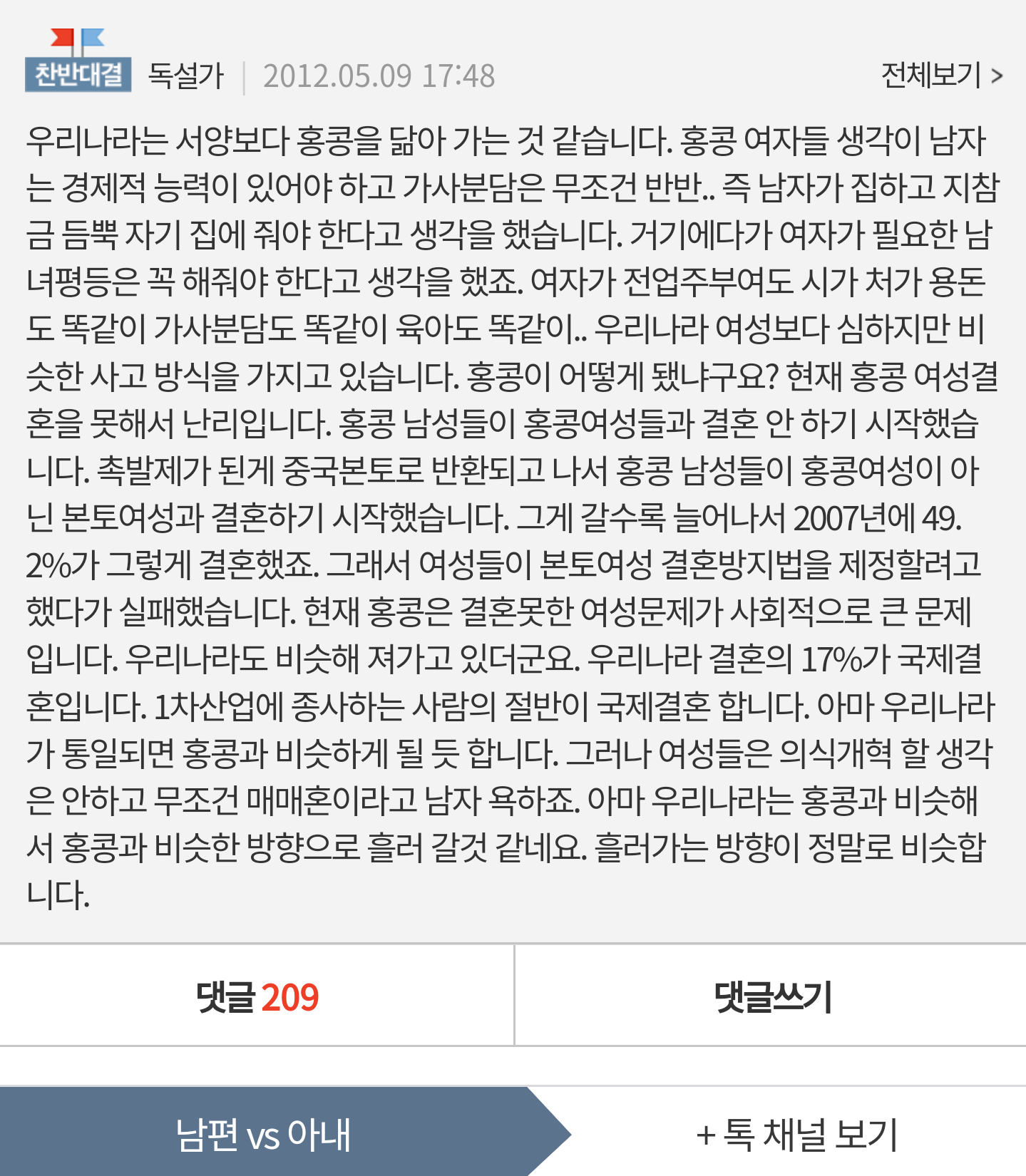 여자들도 한번 결혼하면 평생 노후가 보장되고 안정된 삶이 가능했던 것을 `파괴`한 주범이 페미니즘과 남녀평등사상이라는 것을 알고 있습니다. 남녀평등주의로 인해 그들에게 돌아온 것은 신세계가 아니라 고단하게 직장을 다녀야 하는 삶과 미혼모 그리고 언제 집에서 쫓겨날지 모르는 불안감이었습니다. 그래서 아직도 남녀평등이니 페미니즘이니 하고 떠들고 다니는 여자들은 왕따를 당하고 뭘 모르는 철부지 정도로 취급받습니다.