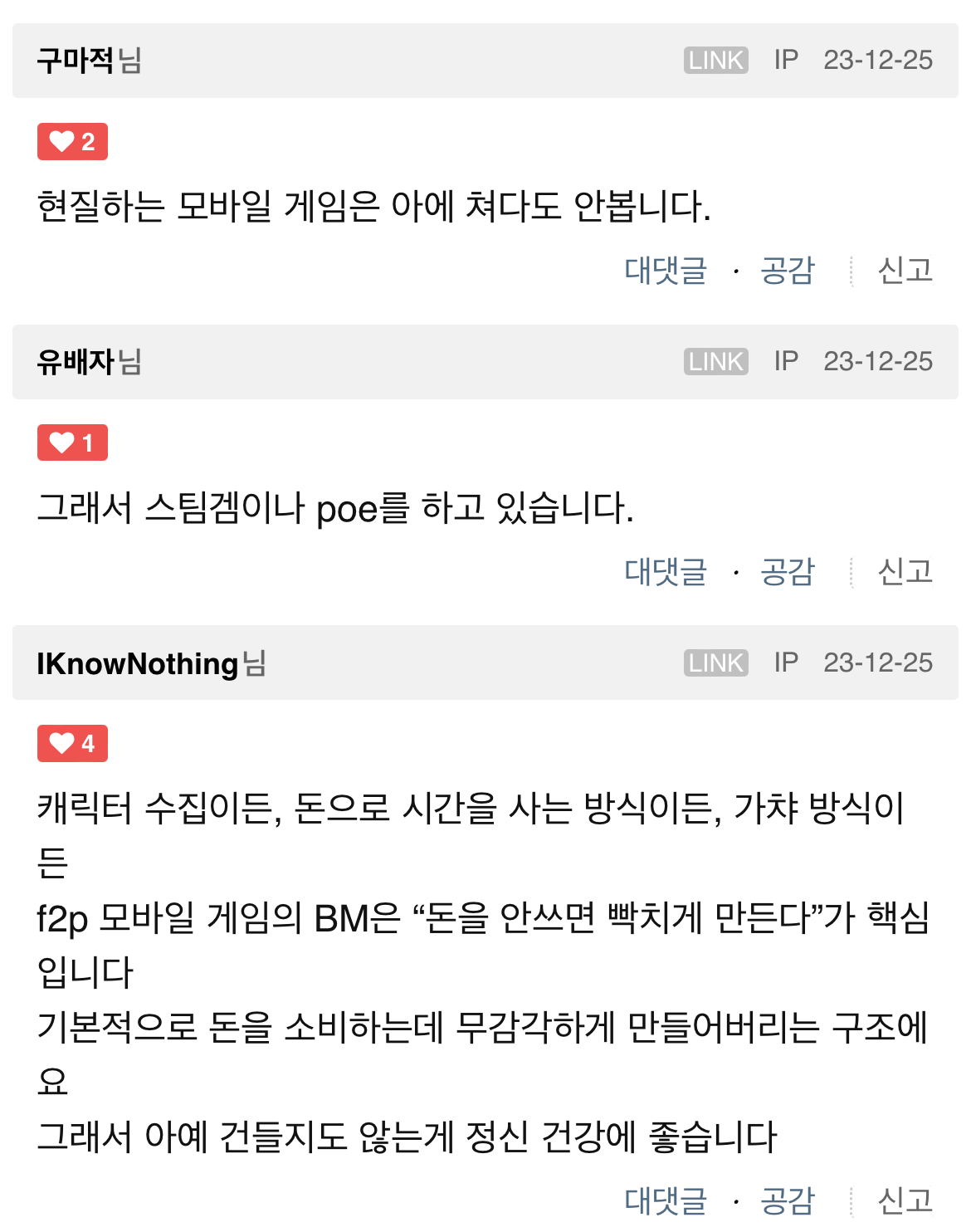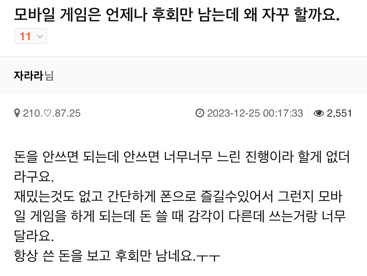 [스크랩] [기타]은근 현타 및 후회하는 사람들 많다는 모바일게임 현질...jpg 작성자요아정 월드|작성시간25.01.27|조회수8,381 목록 댓글 52 글자크기 작게가 글자크기 크게가 출처 : https://theqoo.net/square/3129702937 특히나 가챠게임은 더 ㅇㅇ그래서 콘솔게임만 사는 사람도 있다고 함 다음검색 스크랩 원문 : *여성시대* 차분한 20대들의 알흠다운 공간 현재 게시글 추가 기능 열기 북마크 공유하기 신고 센터로 신고 댓글 댓글 52 댓글쓰기 답글쓰기 댓글 리스트 작성자엘리너해물파전 | 작성시간 25.01.27 나도 뽑기게임에 눈돌아서 백수시절에 한달에 50쓰고 바로 현타와서 지워버림 작성자단호박타르트 | 작성시간 25.01.27 하 나도 진짜 그만해야지 작성자그라데이션인생 | 작성시간 25.01.27 좆피위피 재료올리기 귀찮아서 사그싶은데 비싸.. 작성자아빌립 | 작성시간 25.01.27 콘솔ㄱㄱ콘솔겜 디스크/카트리지는 중고매매도 되니까 넘좋음 작성자라이언일병구애기 | 작성시간 25.01.28 스트레스 좆나받네.. 댓글 전체보기