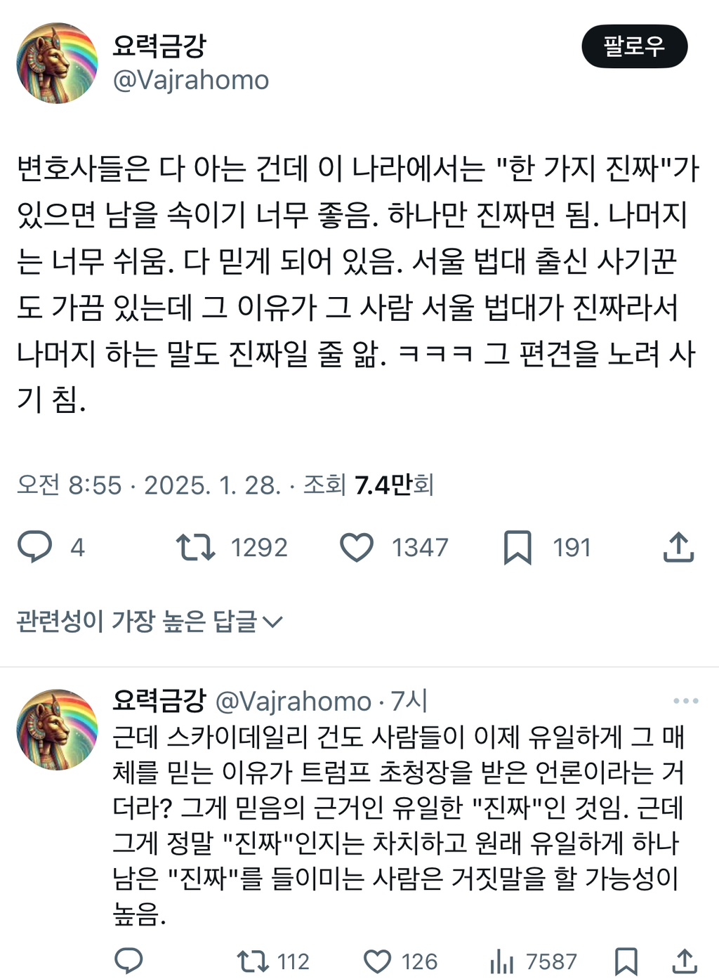 [스크랩] [흥미돋]변호사들은 다 아는 건데 이 나라에서는 "한 가지 진짜"가 있으면 남을 속이기 너무 좋음.twt