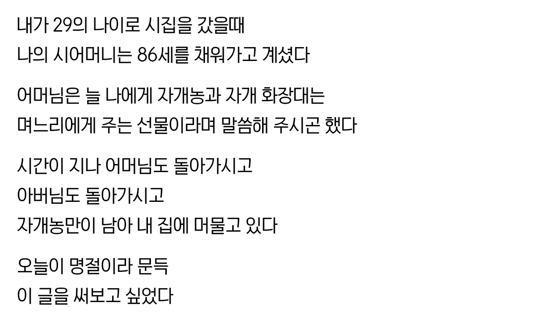 [흥미돋]시어머니가 물려주신 자개 가구.jpg 작성자Ihicoi|작성시간25.01.28|조회수42,328 목록 댓글 190 글자크기 작게가 글자크기 크게가 출처: https://www.threads.net/@madame_moon90/post/DFWg3xczMeV?xmt=AQGzLxvTqd2Q8ahMYmxCYI8XkmWGhFe7UiN8Rr734_V_Mw 아름다워 ⋯ 다음검색 현재 게시글 추가 기능 열기 북마크 공유하기 신고 센터로 신고 댓글 댓글 190 댓글쓰기 답글쓰기 댓글 리스트 작성자jsfuenkc | 작성시간 25.01.29 남편 몇살일까 시어머니 말고 시할머니.나이 아닌가 작성자jirxaxa | 작성시간 25.01.29 아씨 이렁거면 진짜 자개가구에 맞춰서 인테리어 할 의향100% 작성자급피곤 | 작성시간 25.01.30 궁전에있을거같아..ㄷㄷㄷ 작성자소녀가온다 | 작성시간 25.01.30 와......... 작성자일룸이낫띠 | 작성시간 25.01.31 진짜 이쁘다 댓글 전체보기