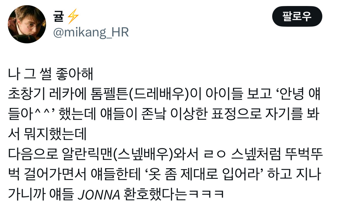 [흥미돋]해리포터 레드카펫에서 말포이 배우가 어린애들한테 ‘안녕 얘들아^^’ 했는데 ㅈㄴ이상한 표정으로 자기를 쳐다봐서 뭐지? 했는데