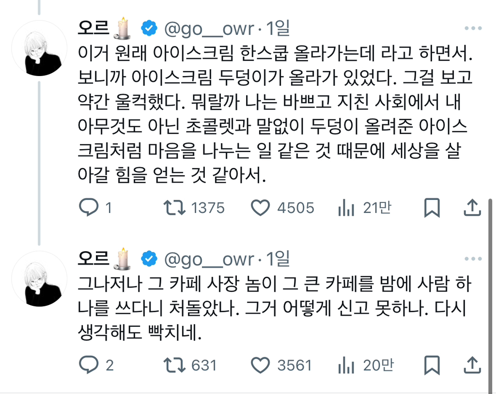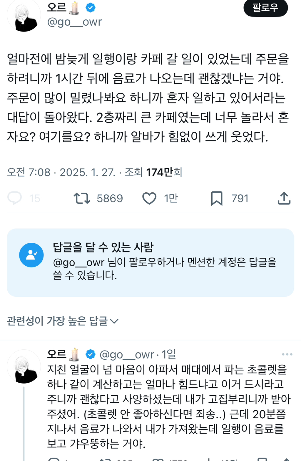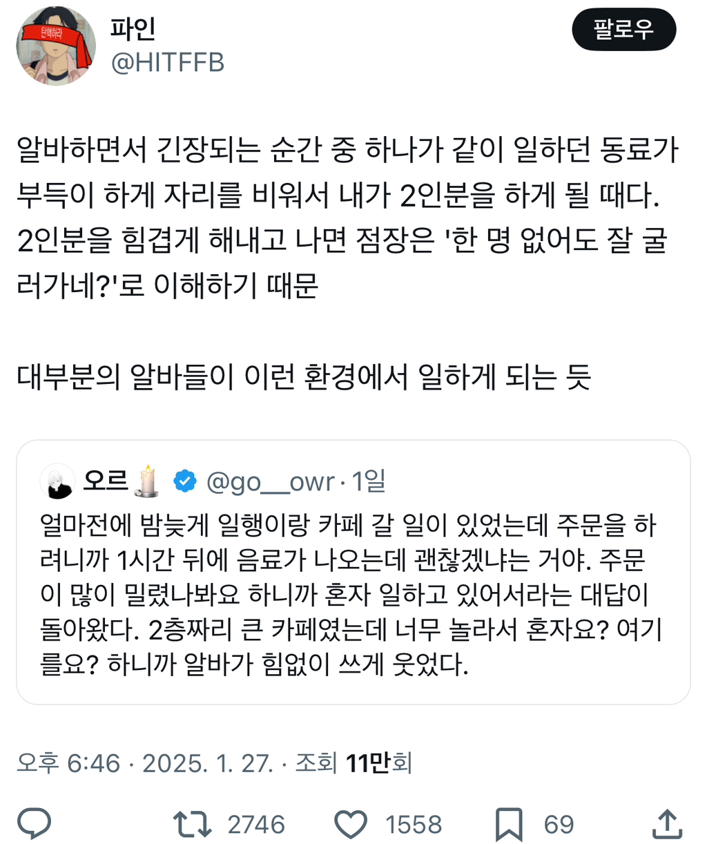 [스크랩] [흥미돋]알바하면서 긴장되는 순간 중 하나가 같이 일하던 동료가 부득이 하게 자리를 비워서 내가 2인분을 하게 될 때다. Twt 작성자21722|작성시간25.01.28|조회수7,363 목록 댓글 18 글자크기 작게가 글자크기 크게가 다음검색 스크랩 원문 : 쭉빵카페 현재 게시글 추가 기능 열기 북마크 공유하기 신고 센터로 신고 댓글 댓글 18 댓글쓰기 답글쓰기 댓글 리스트 작성자(본인 닉네임) 25년홧팅 | 작성시간 25.01.28 리뷰테러간다ㅡㅡ 작성자금잔대 | 작성시간 25.01.28 공차 매니저 생각나네^^ 작성자그래서 말인데 | 작성시간 25.01.28 손님의 배려와 알바의 정신없이 빠른 손으로 이득보는건 사장뿐이네재수탱 작성자잠은죽어서자라 | 작성시간 25.01.28 이게되네? 히는거 진짜 ㅋㅋㅋ 작성자아몬드봉봉봉봉봉봉 | 작성시간 25.01.29 돈을 2인분 달라고 댓글 전체보기