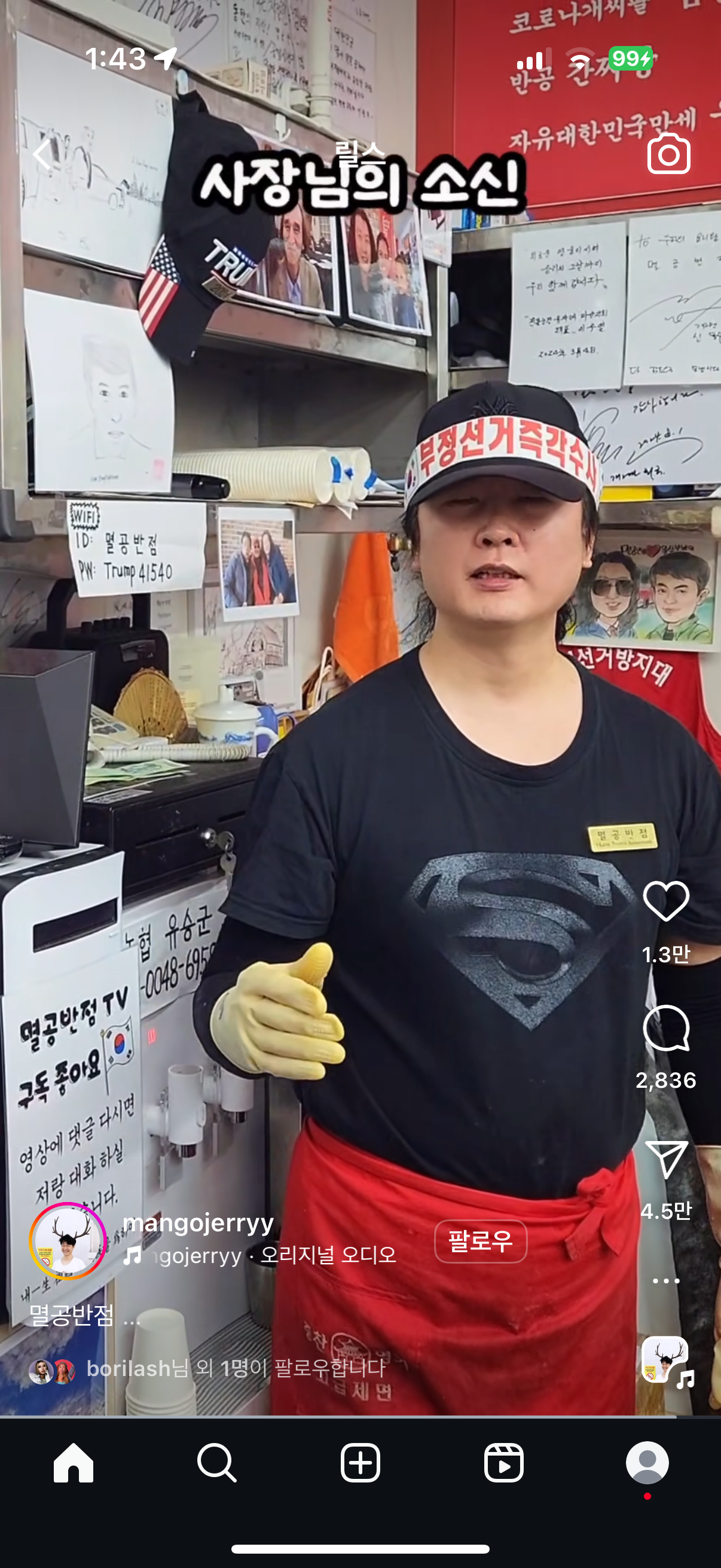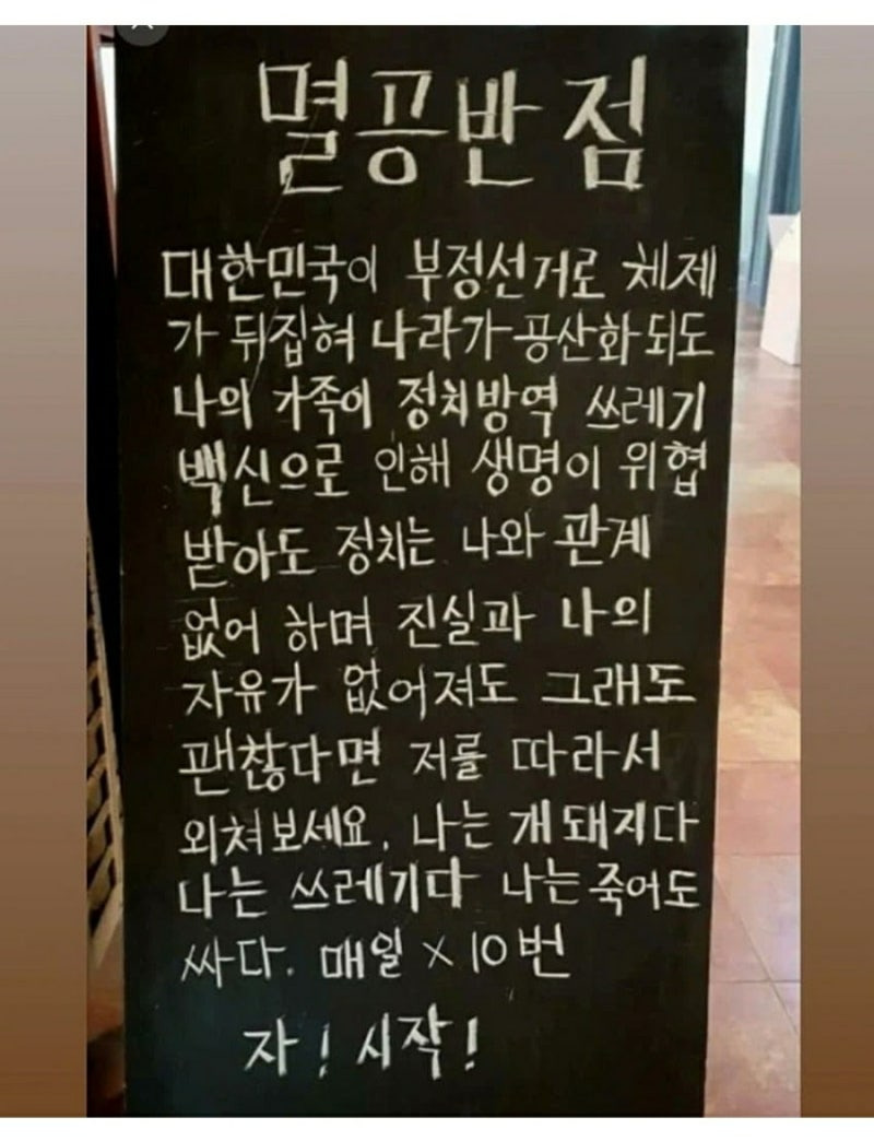 [흥미돋]동탄에 위치한 ‘멸공반점’ 근데 중국집인… 작성자레모나모나미|작성시간25.01.29|조회수15,266 목록 댓글 36 글자크기 작게가 글자크기 크게가 출처: 여성시대 레모나모나미참으로 모순적인 식당이 있어 퍼옴중국집인데 멸공을 외치시는 ㅋㅋㅋㅋㅋ 다음검색 현재 게시글 추가 기능 열기 북마크 공유하기 신고 센터로 신고 댓글 댓글 36 댓글쓰기 답글쓰기 댓글 리스트 작성자돈.내놛 | 작성시간 25.01.29 어 조선족 2찍들이네?ㅋㅋ 2찍들은 조선족이들 좌파라고 우기더만ㅋㅋ 작성자필리스 | 작성시간 25.01.29 조선족이 멸공해도대??핑핑이안무섭나 작성자뉴진스이혜인 | 작성시간 25.01.29 2찍들이 조선족 개혐오하던데ㅎㅎ 작성자냥르장머리 | 작성시간 25.01.30 조선족이 멸공ㄱㅋㅋㅋㅋㄱㅋ멸공 뜻 모르는거 아녀? 작성자조심또조심 | 작성시간 25.12.09 ㅋㅋㅋㅋㅋㅋㅋㅋㅋㅋㅋㅋ이게뭐야 댓글 전체보기