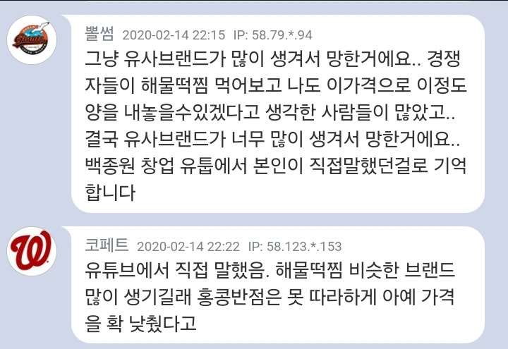 [스크랩] [흥미돋]해물떡찜 망한이유 + 다시 돌아옴 작성자밈민밈민|작성시간25.01.30|조회수49,463 목록 댓글 29 글자크기 작게가 글자크기 크게가 출처: 여성시대 (.본인 닉네임)존맛탱이었던 해물떡찜즉석떡볶이에 중식의 웍질 해물을 더한 음식> 폐업이유 : 따라하는 가게가 너무 많아짐> 해물+떡+찜 > 일반명사라서 상표권 불가아는 맛이라 맛있었지만남들이 절대 못따라할 수준의만들기 어려운 메뉴도 아니었음다시 돌아왔대 한신포차 메뉴로광고아님유튜브보다가 백종원 더본코리아 상장한다고해서해물떡찜 왜 망했는지 찾다가 봄...^^ 다음검색 스크랩 원문 : *여성시대* 차분한 20대들의 알흠다운 공간 현재 게시글 추가 기능 열기 북마크 공유하기 신고 센터로 신고 댓글 댓글 29 댓글쓰기 답글쓰기 댓글 리스트 작성자신한카드99 | 작성시간 25.01.30 난 그저그랬는데.. 코엑스에서 먹었는데 너므 평범했음 작성자유정이좋아 | 작성시간 25.01.30 예전에 모란역에 있던거 갔었는데 ㅋㅋㅋ 작성자알리오올리오럽 | 작성시간 25.01.30 똥튀김이랑 머거야하는데ㅜㅜ 작성자돈많이벌게해주세요. | 작성시간 25.01.30 해물떡찜 완전 좋아했는데.... 똥튀김이 있어야 된다고요... 작성자엽떡맛있어요 | 작성시간 25.01.30 똥튀김이라니 너무 비위상하는데 엄청 맛있나부네 댓글 전체보기