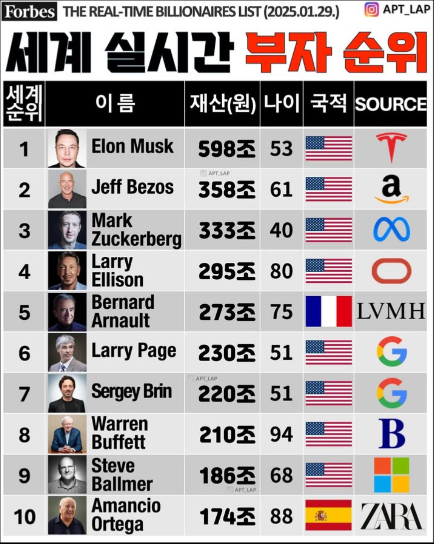 [흥미돋]포브스 선정 세계 실시간 부자 순위 작성자Dlywweeee|작성시간25.01.30|조회수22,013 목록 댓글 23 글자크기 작게가 글자크기 크게가 출처: 여성시대 Dlywweeee 다음검색 현재 게시글 추가 기능 열기 북마크 공유하기 신고 센터로 신고 댓글 댓글 23 댓글쓰기 답글쓰기 댓글 리스트 작성자활성탄 | 작성시간 25.01.30 다 백인남성인게 열받음 작성자락윌네버다이 | 작성시간 25.01.30 빌게이츠 이제 굶어 죽는거야???🥹 작성자레이빠방 | 작성시간 25.01.30 일론아 50억만주라 작성자산책러 | 작성시간 25.01.30 빌 게이츠는 순위에도 없네. 그리고 자라가 삼성이나 현대보다 더 크구나 작성자dnwmwoodz | 작성시간 25.01.30 저사람들한테 10억은 껌값일텐데 10억씩만 댓글 전체보기