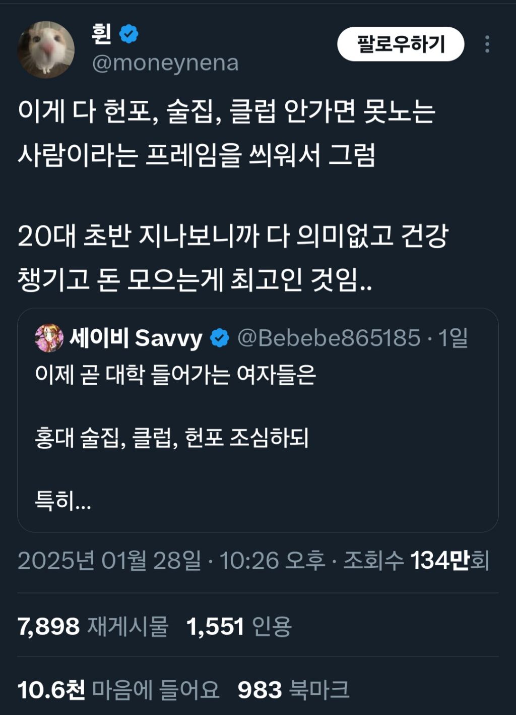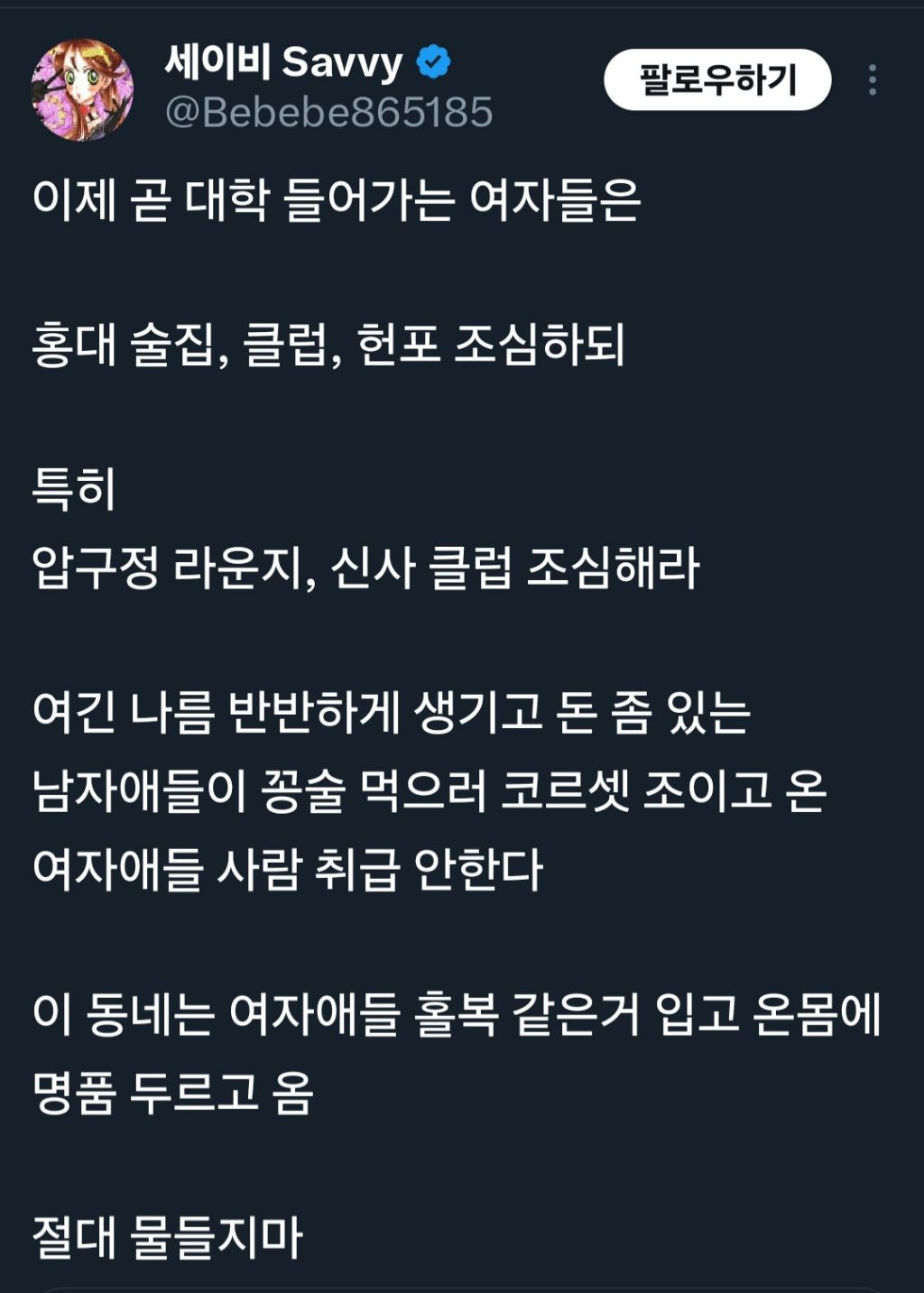 [기타]이제 곧 대학 들어가는 여자들은 홍대 술집, 클럽, 헌포 조심하되 특히 압구정 라운지, 신사 클럽 조심해라.twt