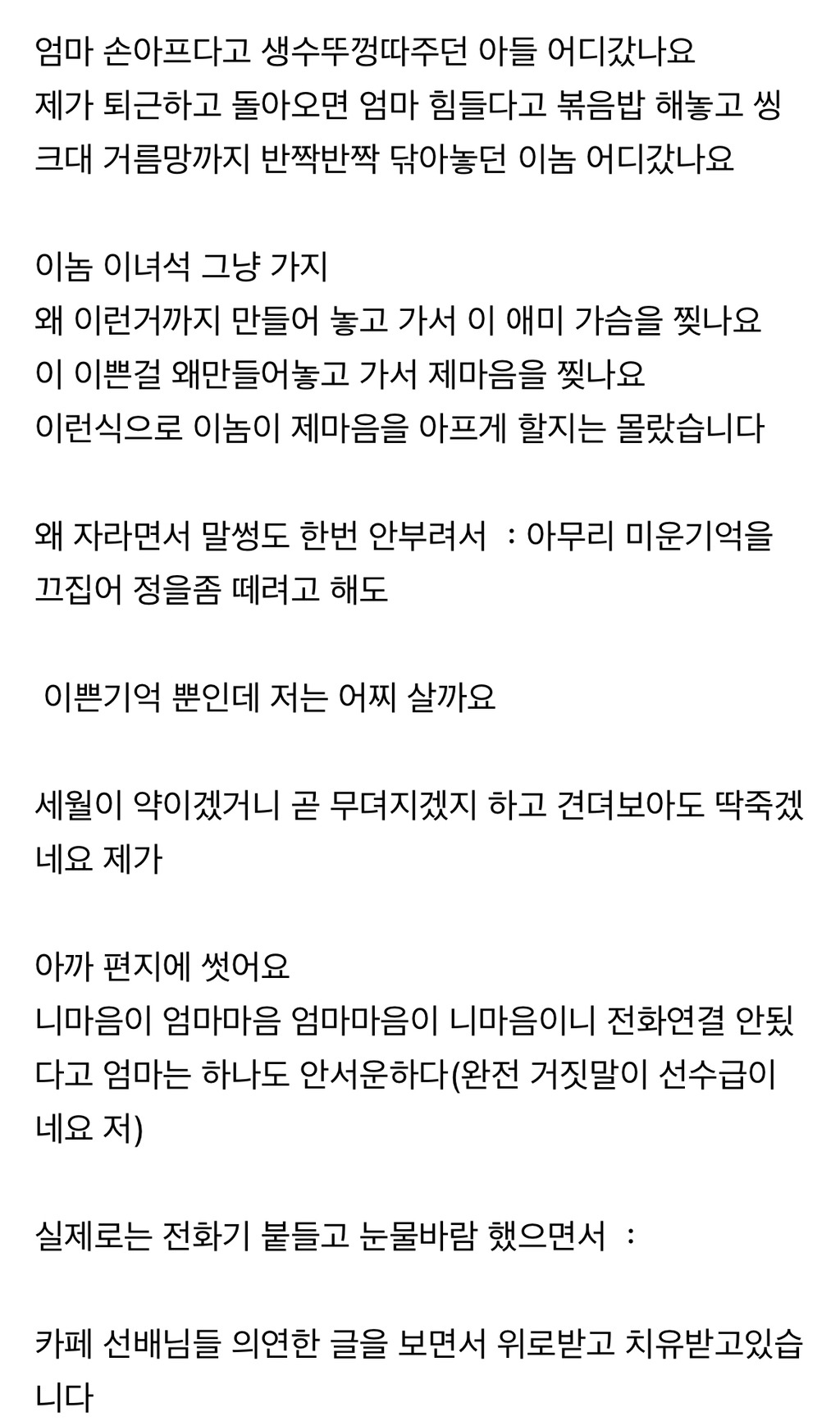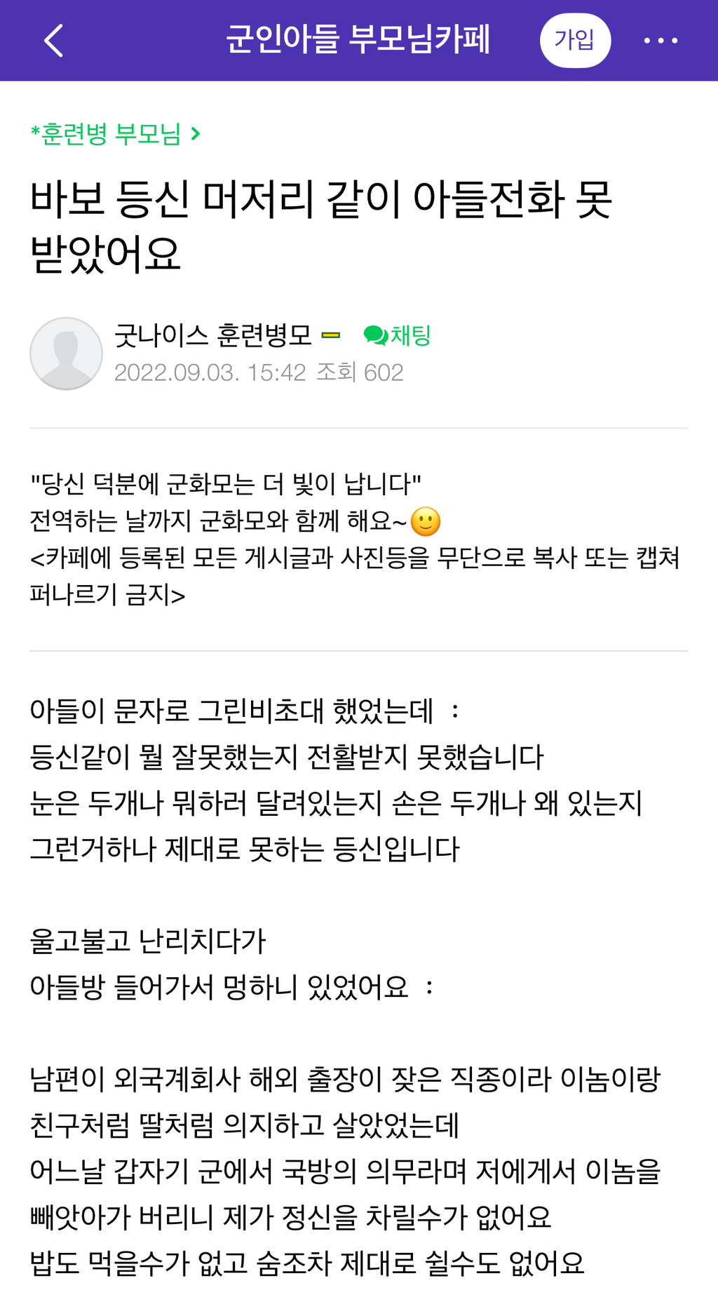 [흥미돋]군대간 아들 전화 못받아서 숨 못쉬는 어머니 작성자입력하세요용|작성시간25.01.31|조회수39,163 목록 댓글 590 글자크기 작게가 글자크기 크게가 출처: https://img.dmitory.com/img/202412/2ke/WOO/2keWOOgljGKySiU2YmW4ak.jpg 다음검색 현재 게시글 추가 기능 열기 북마크 공유하기 신고 센터로 신고 댓글 댓글 590 댓글쓰기 답글쓰기 댓글 리스트 작성자뿌링구 | 작성시간 25.02.02 며느리 생기면 어떨지.. 작성자민수헴 | 작성시간 25.02.03 그린비가 뭔지몰라서 찾아봤더니 뭐 군인 영상통화? 하는 어플이라네ㅋㅋㅋㅋ아니 누가보면 죽은줄알겠아요;; 작성자동시흥분기점 | 작성시간 25.02.04 뭔 ㅋㅋㅋㅋㅋㅋㅋㅋㅋ 파병보냈냐고 북한보냈냐고 작성자천ㅇ앤 | 작성시간 25.02.13 ㅋㅋㅋㅋ 작성자묘뮤 | 작성시간 25.02.14 아드님 캠프 가셨습니다.. 댓글 전체보기