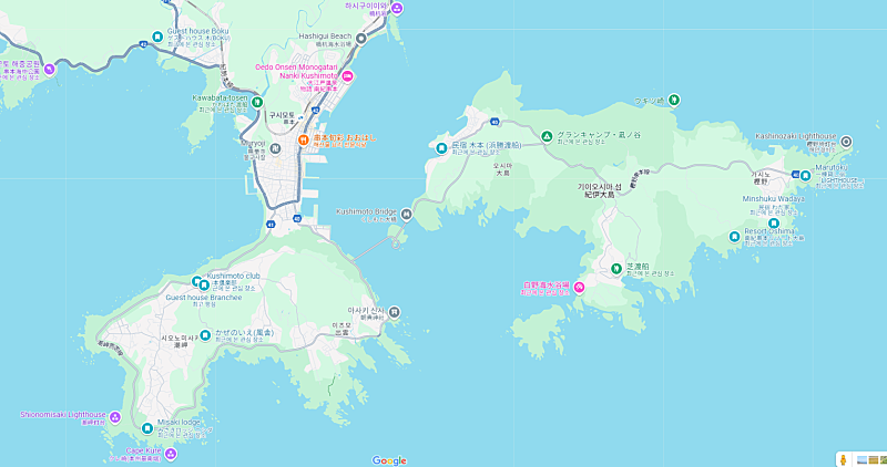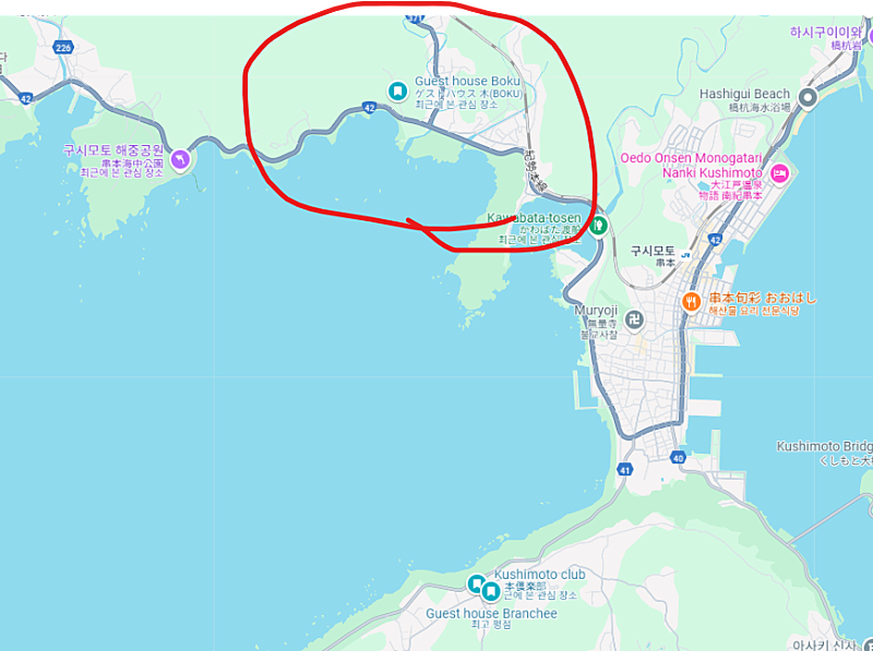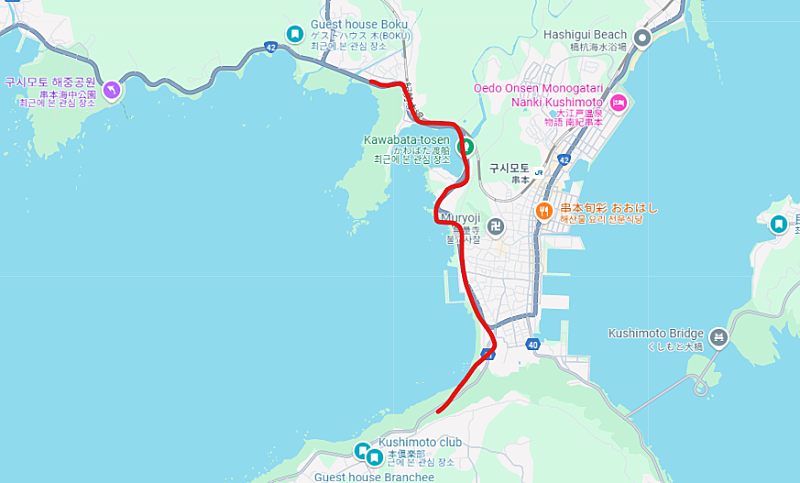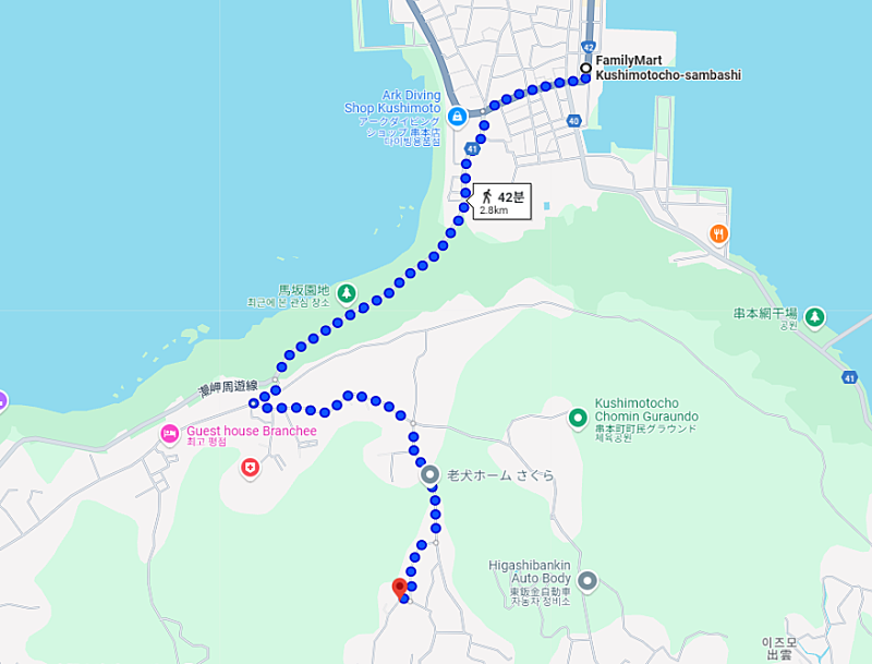 → 버스의 운행 방향을 구글맵으로 검색해보면 스에교코 정류장을 거쳐 섬의 동쪽 끝까지 갔다가 다시 구시모토 시내로 돌아오는 노선입니다. 윤세준씨는 16:32에 버스에 탑승하여 구시모토 시내에서 내릴 때까지 쭉 버스에 탑승하고 있었다고 판단됩니다.