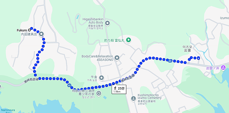 → 패밀리마트에서 식료품을 구입한 17:21과 체크인 시점인 18:00 사이에 패밀리마트 근처에서 탑승 가능한 버스는 없습니다. 구글맵을 통해 확인할 수 있습니다. 따라서 패밀리마트에서 숙소인 <후쿠로>까지는 걸어갔을 것으로 추측됩니다. 구글맵으로 소요시간을 확인해보면 도보 42분 가량으로 나오는데, 시간상으로도 거의 맞아떨어집니다.