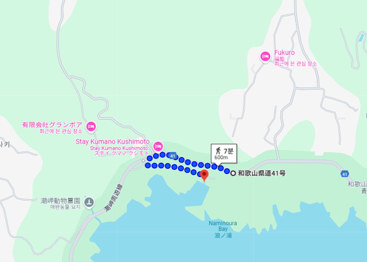 → 16:00에 구시모토 역에서 탑승할 수 있는 버스는 와부카선(회색 버스), 시오노미사키선(초록 버스) 두 종류입니다. 와부카선은 구시모토 시내에서 서북쪽 방향으로 쭉 가는 노선이고, 시오노미사키선은 남쪽으로 내려가는 노선인데 이후의 행적을 고려하여 시오노미사키선을 탑승한 것으로 추정한 듯합니다.