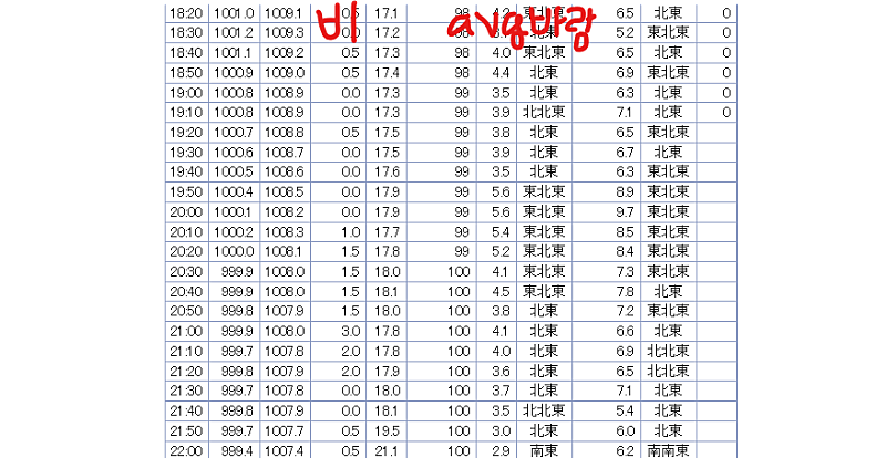 좌측에서 4번째 열이 강수량(mm), 7번째 열이 평균 풍속(m/s), 9번째 열이 최대 순간 풍속(m/s)입니다.