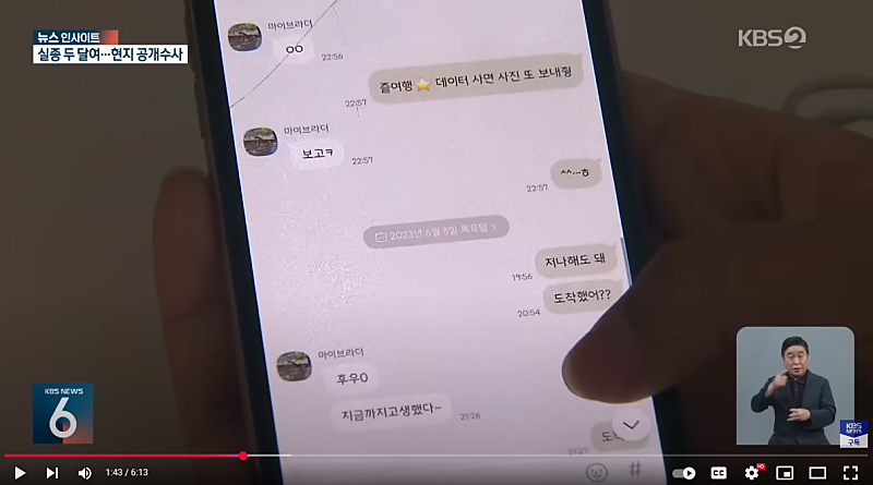 KBS의 2023년 7월 31일 보도 화면입니다. 6월 6일로 추정되는 날의 대화에 누나가 "데이터 사면 사진 또 보내줭" 이라고 언급한 것을 볼 때, 윤세준씨와 누나 모두 데이터가 거의 소진되었다는 것을 인지하고 있는 것으로 보입니다. 데이터 추가 구매를 염두에 두고 있지 않았을까 하는 생각입니다.