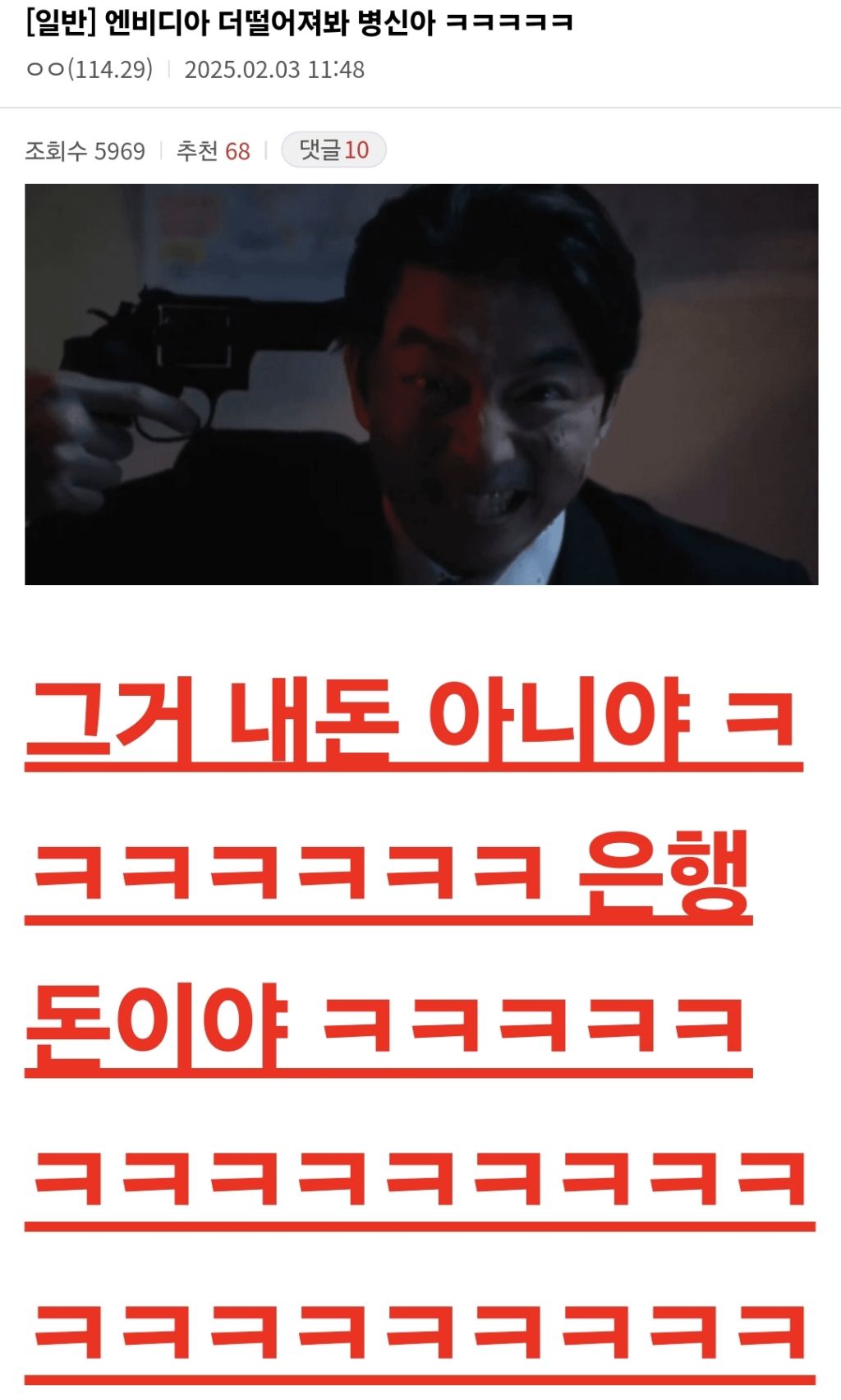[스크랩] [흥미돋]주식 개판난 오늘자 미국주식갤러리 모음.jpg 작성자만명의근원|작성시간25.02.03|조회수16,583 목록 댓글 57 글자크기 작게가 글자크기 크게가 다음검색 스크랩 원문 : 도탁스 (DOTAX) 현재 게시글 추가 기능 열기 북마크 공유하기 신고 센터로 신고 댓글 댓글 57 댓글쓰기 답글쓰기 댓글 리스트 작성자뿡빠레를울려 | 작성시간 25.02.03 난 아직 괜찮던데.. 작성자유토루 | 작성시간 25.02.03 ㅅㅂ 장례식장 돌았나ㅋㅋㅋㅋㅋㅋㅋ 작성자해피밀 | 작성시간 25.02.03 와 오늘 진짜 다 퍼렇네;; 작성자뱃걸리리 | 작성시간 25.02.03 마포폐짘ㅋㅋㅋㅋㅋㅋㅋㅋㅋㅋㅋㅋ 작성자gutgemacht | 작성시간 25.02.05 떡락한날 삿는데 아직 왓다갓다 하네 댓글 전체보기