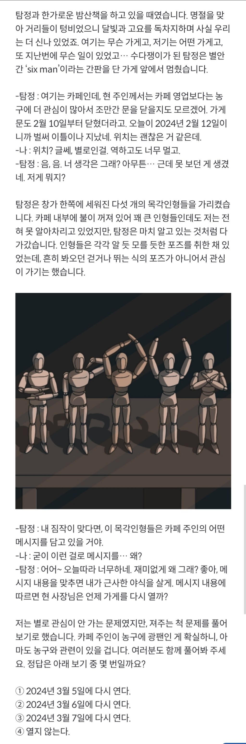 [흥미돋]국정원 추리 퀴즈 25 작성자밍밍이랑|작성시간25.02.04|조회수6,985 목록 댓글 6 글자크기 작게가 글자크기 크게가 출처: https://www.nis.go.kr/CM/1_5_1/view.do?seq=3684¤tPage=3&selectBox=0&searchKeyword=&fromDate=&toDate=NIS 국가정보원대한민국 국가정보원 공식 홈페이지www.nis.go.kr정답은 댓글로문제시 응가 다음검색 현재 게시글 추가 기능 열기 북마크 공유하기 신고 센터로 신고 댓글 댓글 6 댓글쓰기 답글쓰기 댓글 리스트 답댓글 작성자밍밍이랑 작성자 본인 여부 작성자 | 작성시간 25.02.06 정답댓🐶 이미지 확대 작성자영웅들이여 | 작성시간 25.02.04 4번 근데 탐정이 샀니? 답댓글 작성자영웅들이여 | 작성시간 25.02.04 마지막 두개가 퇴장하고 선수 교체 작성자읂어하고참왜하라 | 작성시간 25.02.04 농구를 알아야되는건가효 작성자1제이2유한 | 작성시간 25.02.04 카페주인이 농구광팬인건 어떻게 안건데!! 댓글 전체보기