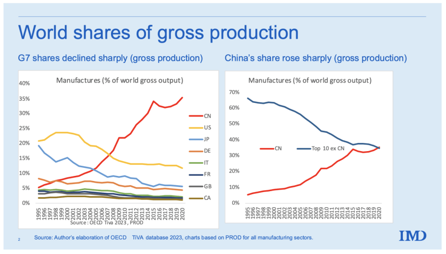 1. 선진국들은 고부가가치 제조업으로 매출은 나쁘지 않으나 생산 기반은 아웃소싱 한지 오래라 생산량으로 보면 미국과 유럽이 합쳐도 중국에 미치기 힘든 수준으로 일상용품은 대부분 중국에 의존중으로 월마트 소비재의 80% 가 중국제.