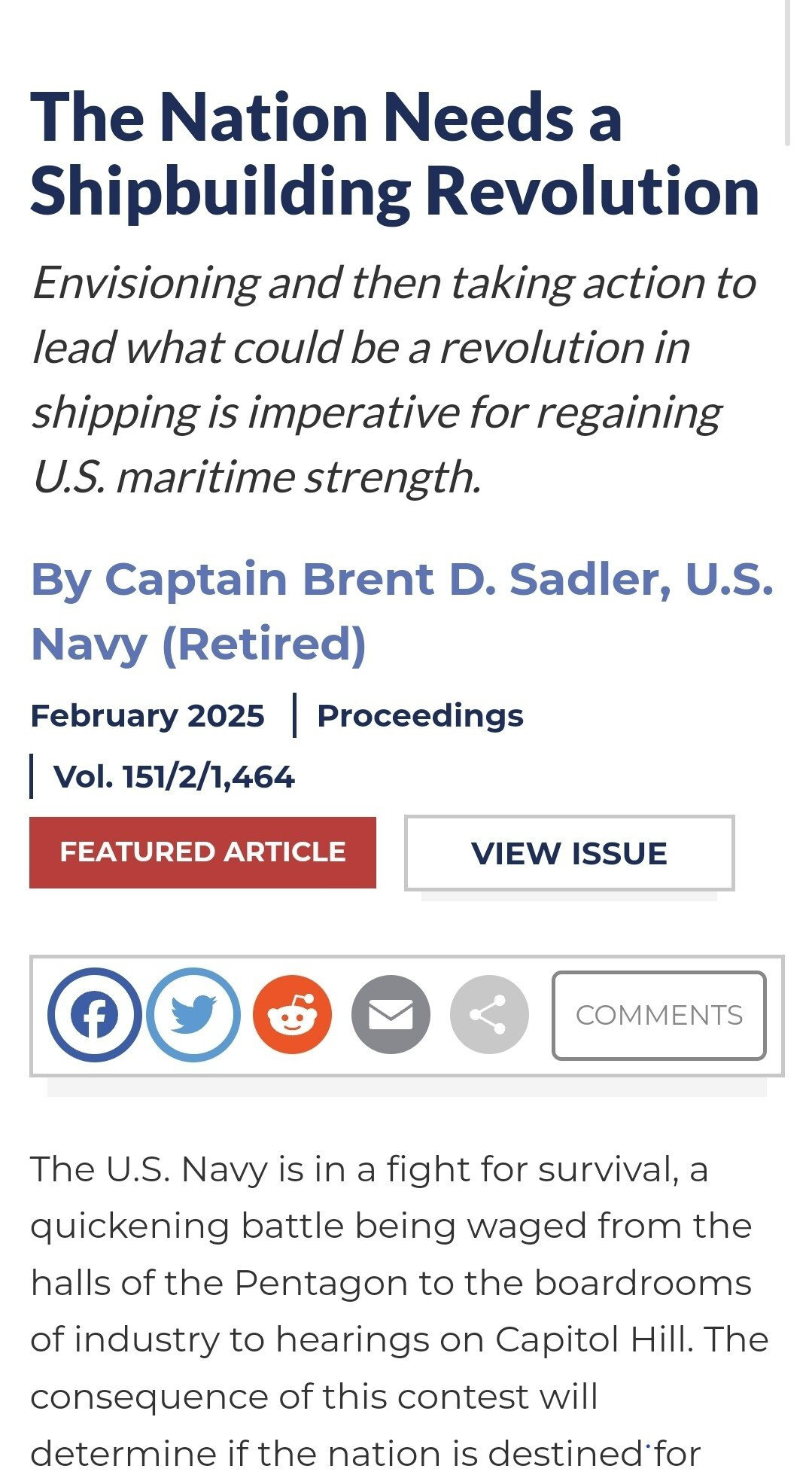 [ 오늘 올라온 미국 해군이 혁명적인 조선업 재건이 없다면 정말 위기라는 칼럼 ]