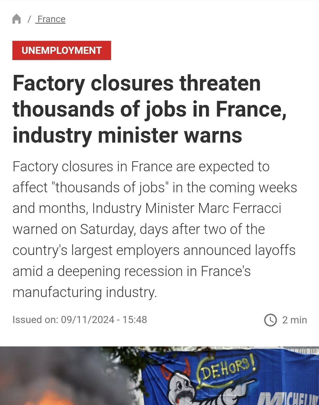 [ 프랑스 최대 타이어 회사인 미쉐린의 프랑스내 공장 2개 폐쇄 및 노동자 수천명 해고 ]