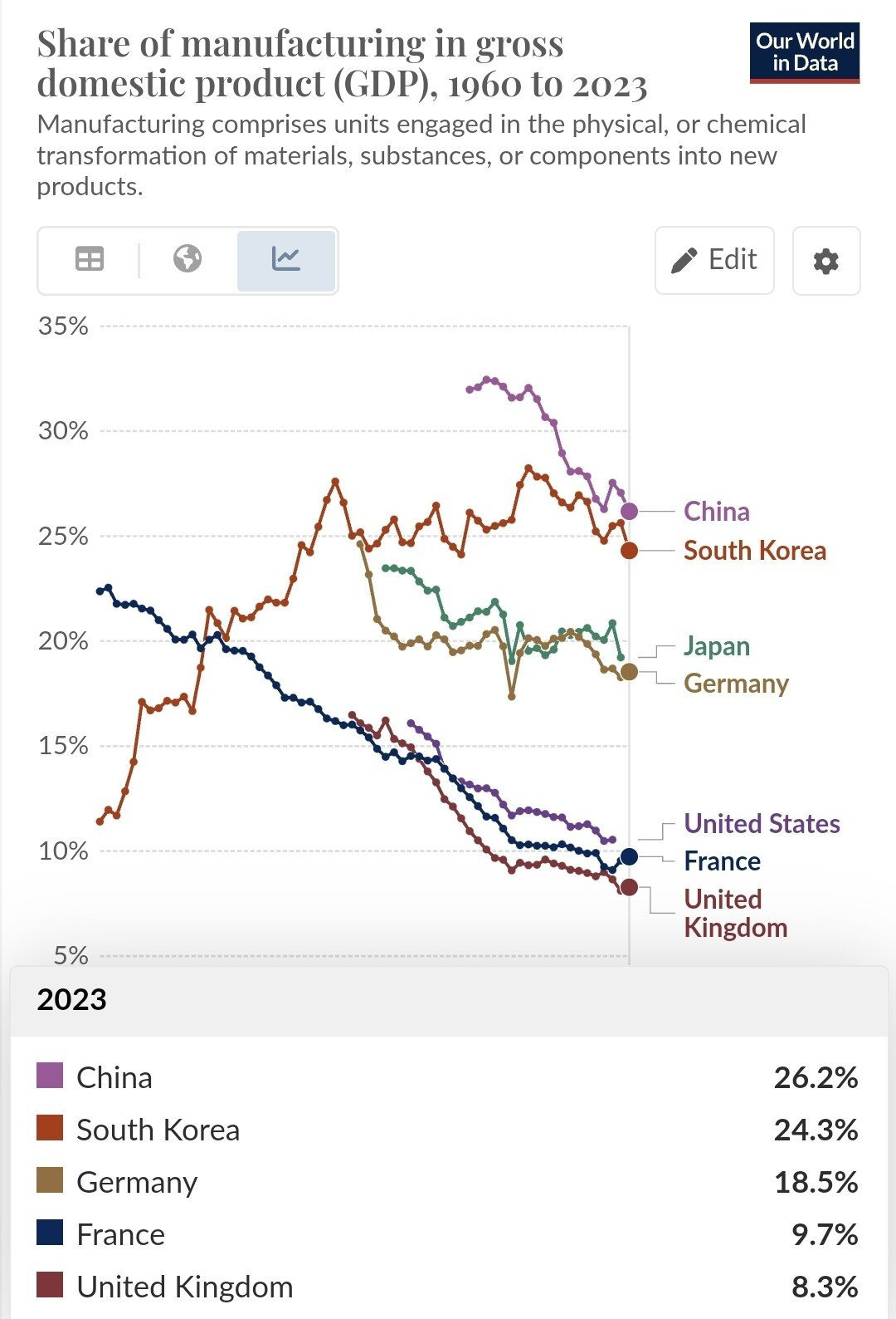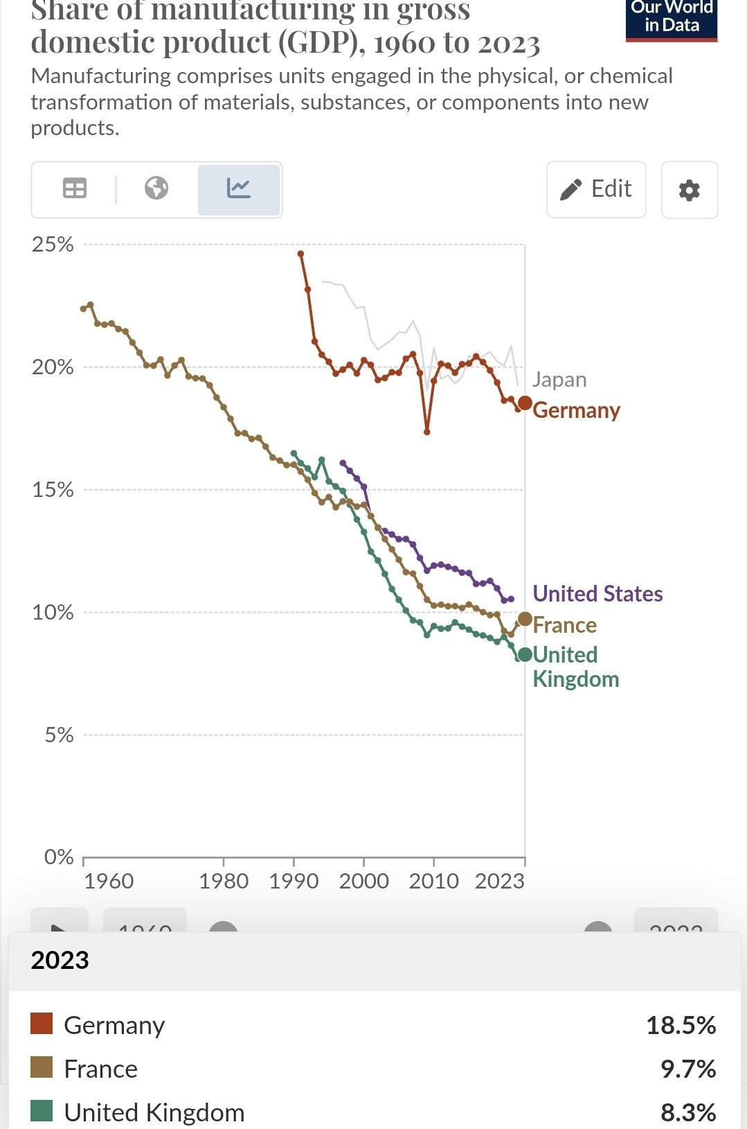 [ 60년간 제조업 비중이 하락해 겨우 8-9% 로 미국보다 제조업 비중이 처참한 영국과 프랑스 ]