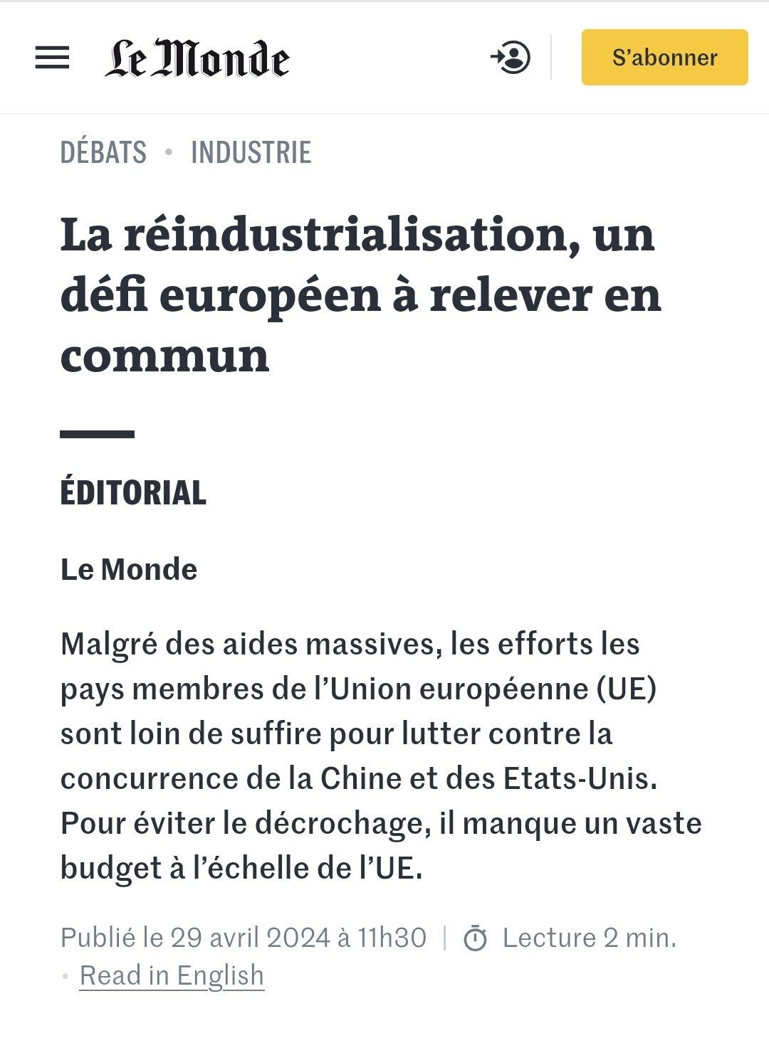 [ 프랑스와 유럽의 재산업화를 촉구하는 프랑스 정부와 르몽드지 ]