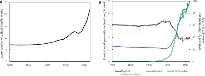 [ 사람의 근력은 이전에 비해 줄어들었으나 기계와 비료로 인류 역사상 어느때보다 농업 생산성이 역대 최고 찍음 ]
