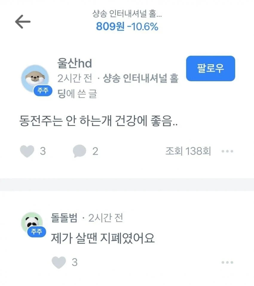 [스크랩] [흥미돋]토스 주식 유저의 일침(?) 작성자Dlywweeee|작성시간25.02.04|조회수4,950 목록 댓글 4 글자크기 작게가 글자크기 크게가 출처: https://theqoo.net/square/3592735811?filter_mode=normal&page=7뭣; 다음검색 스크랩 원문 : *여성시대* 차분한 20대들의 알흠다운 공간 현재 게시글 추가 기능 열기 북마크 공유하기 신고 센터로 신고 댓글 댓글 4 댓글쓰기 답글쓰기 댓글 리스트 작성자델리민주 | 작성시간 25.02.04 아앗... 작성자아휴수박먹고배불르다 | 작성시간 25.02.04 ....하.. 작성자갈무열 | 작성시간 25.02.04 .....남일x 작성자허니카모마일 | 작성시간 25.02.04 저도요 ^^ 댓글 전체보기