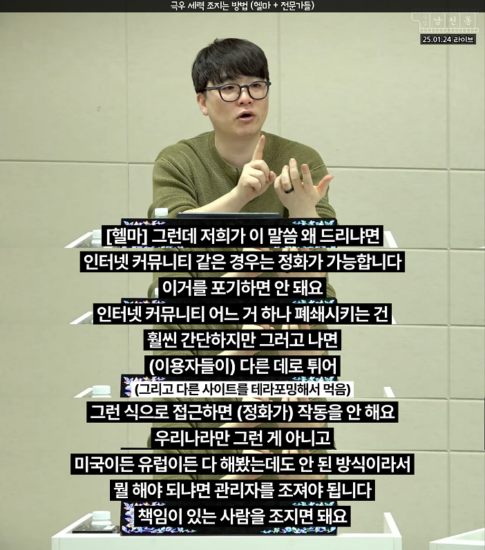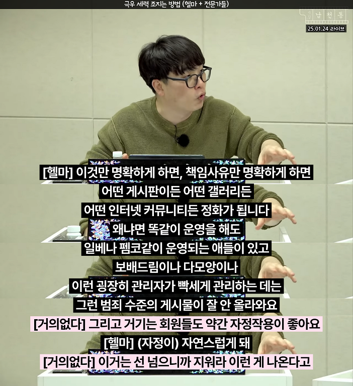 - 헬마(뉴미디어) : 돈줄을 끊고 관리 책임을 명확히 해야하므로 국회에 플랫폼 책임자급(구글 코리아 대표, 네이버 대표) 불러서 책임 따져물어야하고 커뮤니티는 관리자급 불러서 문책해야함(디씨, 펨코 등등)
