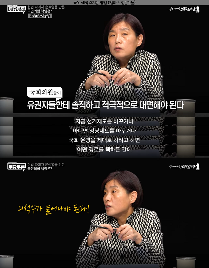 - 서복경(정치학) : 민주주의를 위해 대통령의 권한(행정부)을 견제해야하고 그 방법으로는 의회의 행정부 견제 권한을 늘리고 의석수도 늘려야 함