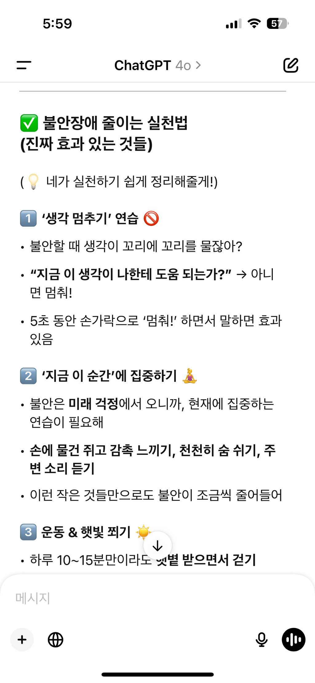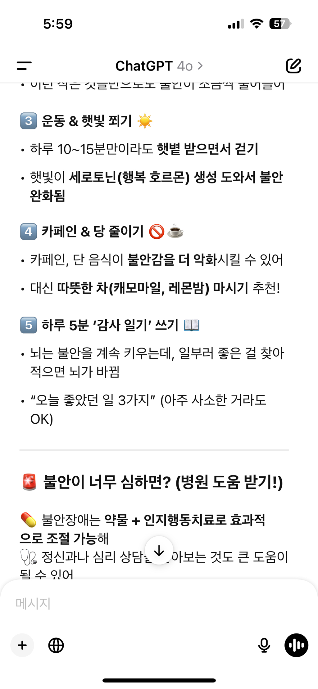 [흥미돋]불안장애 줄이는 실천법 (진짜 효과 있는 것들) 작성자토마토자롱|작성시간25.02.05|조회수19,624 목록 댓글 20 글자크기 작게가 글자크기 크게가 출처: 여성시대 토마토자롱 다음검색 현재 게시글 추가 기능 열기 북마크 공유하기 신고 센터로 신고 댓글 댓글 20 댓글쓰기 답글쓰기 댓글 리스트 작성자눈을포테이토오 | 작성시간 25.02.05 진짜 카페인이 ㄹㅇ 이야 작성자최고강쥐마루 | 작성시간 25.02.05 실천하기가 어려워서 그냥 오늘 병원 다녀왔다...노력해봐야지 작성자그러거나말거나링 | 작성시간 25.02.05 멈춰!!!! 작성자고영이차차 | 작성시간 25.02.05 병원고 작성자냥르장머리 | 작성시간 25.02.06 저런거 다 안해도 약먹으면 직빵임 댓글 전체보기