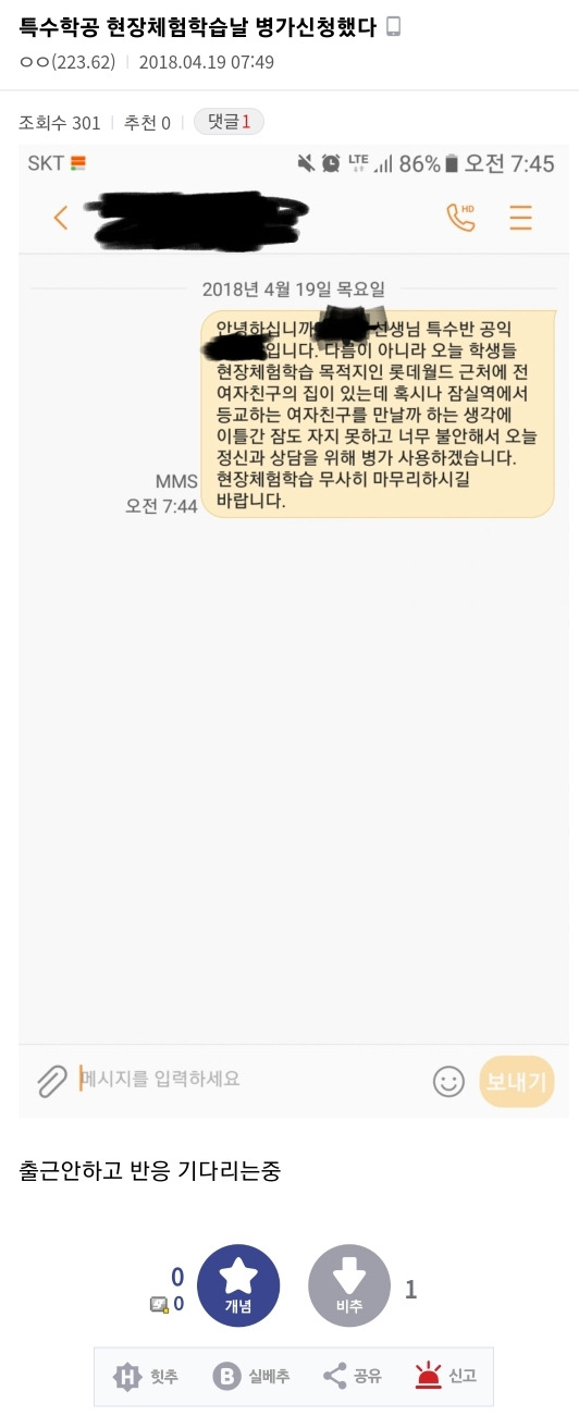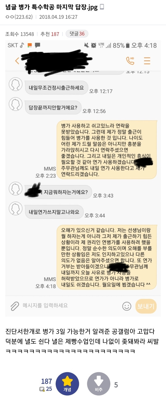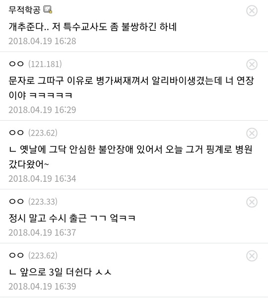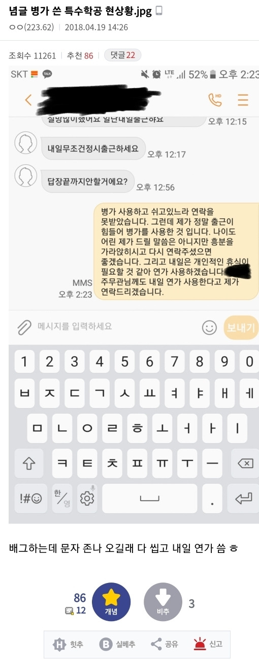 [스크랩] [칵.cxxx]전여친 만날까봐 현장체험학습 당일 병가 신청한 특수학교 공익 작성자에트와르|작성시간25.02.06|조회수5,722 목록 댓글 10 글자크기 작게가 글자크기 크게가 출처: https://m.cafe.daum.net/subdued20club/ReHf/4999779?svc=cafeapp미방 다음검색 스크랩 원문 : *여성시대* 차분한 20대들의 알흠다운 공간 현재 게시글 추가 기능 열기 북마크 공유하기 신고 센터로 신고 댓글 댓글 10 댓글쓰기 답글쓰기 댓글 리스트 작성자아침마당애청 | 작성시간 25.02.07 이래서 공익 싫어하는 거임 ㅡㅡ 작성자핸드폰바꿀거야 | 작성시간 25.02.07 근데 공익 사기진작으로 병원 간 서류 없이 연속 6일 쉬기 가능한걸로 바뀜 개노답이여 작성자가치판단중심 | 작성시간 25.02.07 전여친이 있어? 작성자낮져밤이 | 작성시간 25.02.07 공익남 믿거 작성자맑은별 | 작성시간 25.02.07 특수학교에 왜 공익보내는지 알수가없다 제대로 교육된 직원을 추가하라고 댓글 전체보기