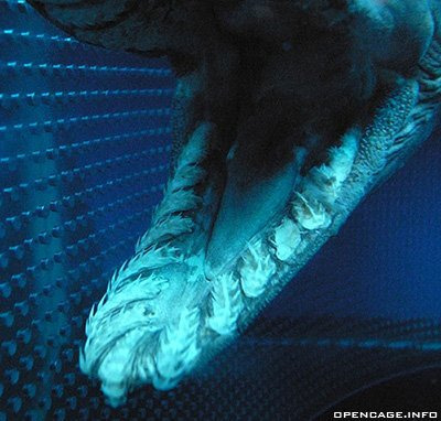 주름상어의 입엔 이처럼 300여개에 달하는 이빨들이 입 안쪽으로 휘어져 홈이 파여져 있는 형태로 나있는데 이는 다른 상어들처럼 먹이를 자르기 위함이 아니라 한 번 문 먹이가 빠져나가지 못하게 막기 위함이며