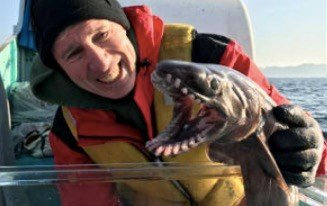 (일본 해안에서 잡힌 주름상어와 사진을 찍는 디스커버리 채널의 데이브 에버트 박사)