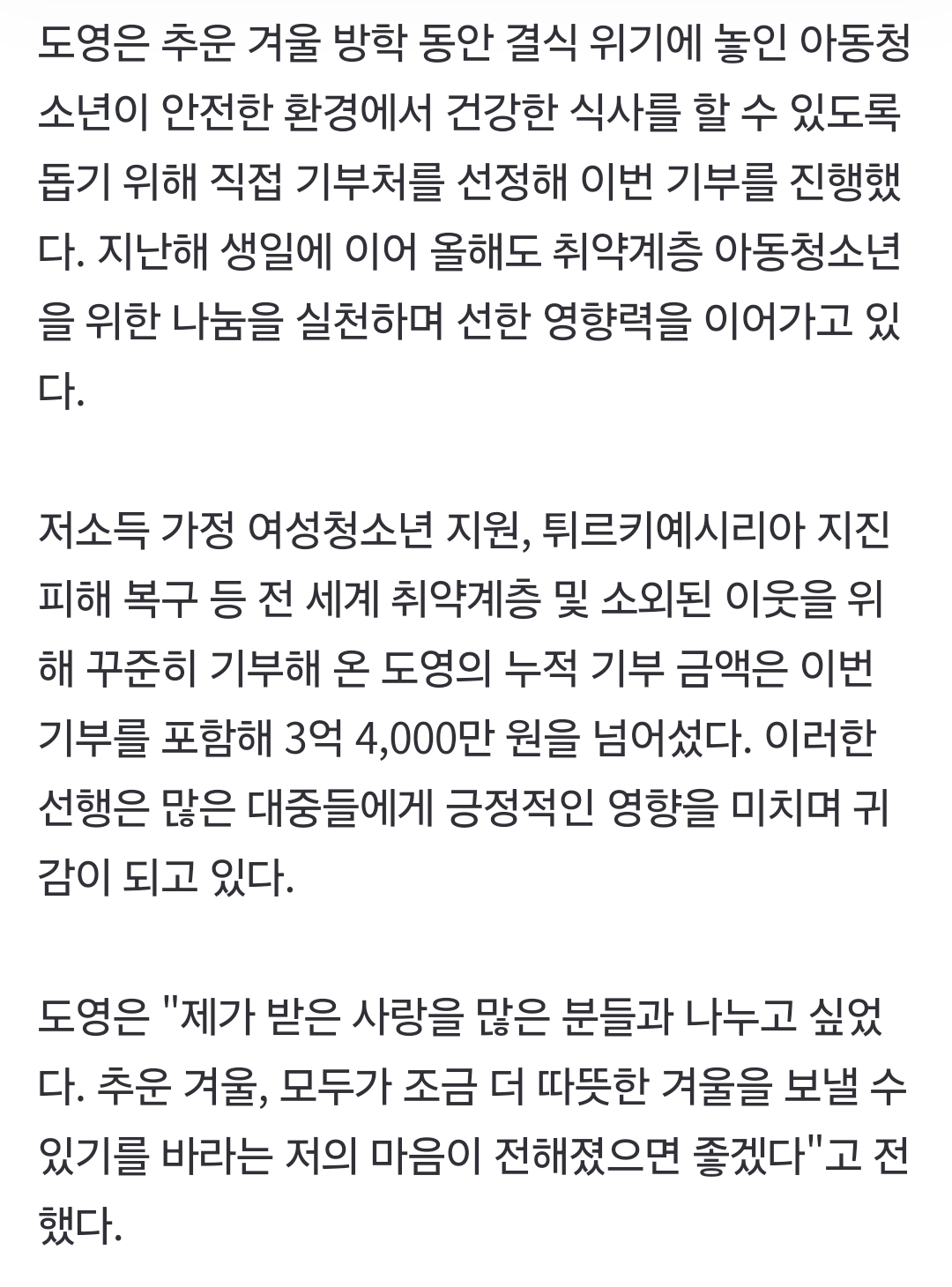 [여시뉴스데스크]NCT 도영, 생일 기념 3천만원 기부…누적 기부액 3억 4천만원[공식] 작성자김 재영|작성시간25.02.07|조회수5,656 목록 댓글 31 글자크기 작게가 글자크기 크게가 출처: https://m.entertain.naver.com/article/609/0000950348NCT 도영, 생일 기념 3천만원 기부…누적 기부액 3억 4천만원[공식]한눈에 보는 엔터 소식m.entertain.naver.com 다음검색 현재 게시글 추가 기능 열기 북마크 공유하기 신고 센터로 신고 댓글 댓글 31 댓글쓰기 답글쓰기 댓글 리스트 작성자솏세 | 작성시간 25.02.07 👏🏻👏🏻👏🏻 작성자월월월월월월월월웡웡 | 작성시간 25.02.07 아직 멀었다 더 기부해라 작성자불주먹청포도 | 작성시간 25.02.07 굿 작성자도지부장관 | 작성시간 25.02.07 기부 꾸준히 하는 연예인보다 얼굴로 광고란 광고는 다 찍는 연예인한테 선플달리는게 현실 ㅋㅋ 여시 보다보면 존나 어이없음 답댓글 작성자쳔읹공로핧ㄷㄷ | 작성시간 25.02.08 ㄹㅇ 댓글 전체보기