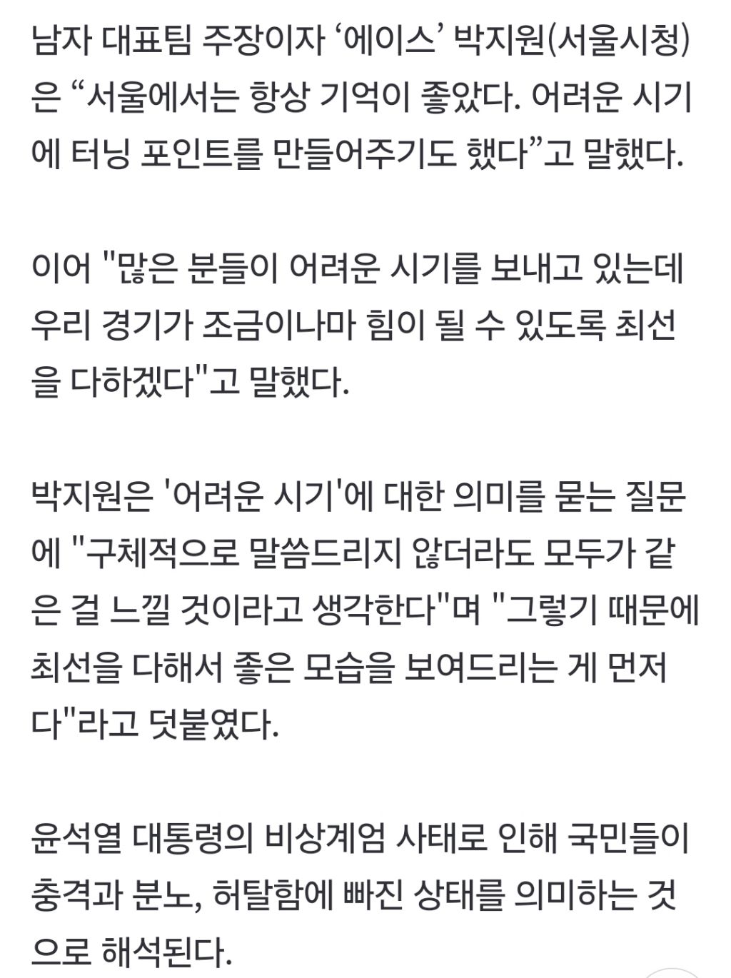 남자 대표팀 주장이자 ‘에이스’ 박지원(서울시청)은 “서울에서는 항상 기억이 좋았다. 어려운 시기에 터닝 포인트를 만들어주기도 했다”고 말했다.