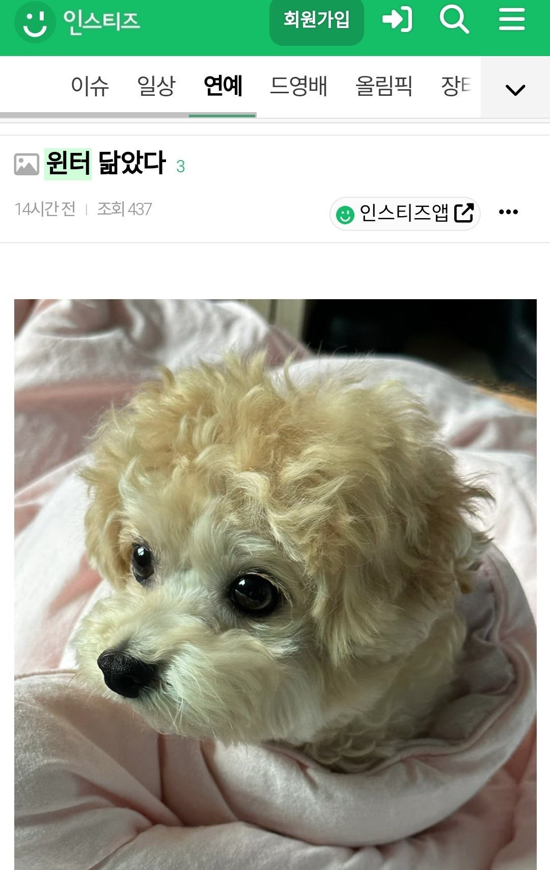 [흥미돋]트위터에서 반응좋은 윈터 닮은 강아지.jpg 작성자바라바라봥|작성시간25.02.08|조회수89,137 목록 댓글 35 글자크기 작게가 글자크기 크게가 출처: 여성시대 바라바라봥 얘가강아지얘가윈터이런 느낌인가 pic.twitter.com/8WLjFbdgSf— 얼쩡민 (@allzzangmin) February 6, 2025 다음검색 현재 게시글 추가 기능 열기 북마크 공유하기 신고 센터로 신고 댓글 댓글 35 댓글쓰기 답글쓰기 댓글 리스트 작성자아스파탐 | 작성시간 25.02.08 ㅠㅠㅠㅠㅠㅠㅠㅠㅠ오쪼쪼ㅠ 작성자용띠대박난다요 | 작성시간 25.02.08 와 ㅁㅊ ㅋㅋㅋㅋ 눈물자국 하나두 없네 넘 예쁘다 작성자냥르장머리 | 작성시간 25.02.08 앵 넘나 닮음 작성자오징어안지킴이 | 작성시간 25.02.09 이렇게보니 윈터가 진짜 갱얼쥐상이구나 넘ㄱㅇㅇ 작성자누운 고등어 | 작성시간 25.02.11 아기양같아♡ 댓글 전체보기