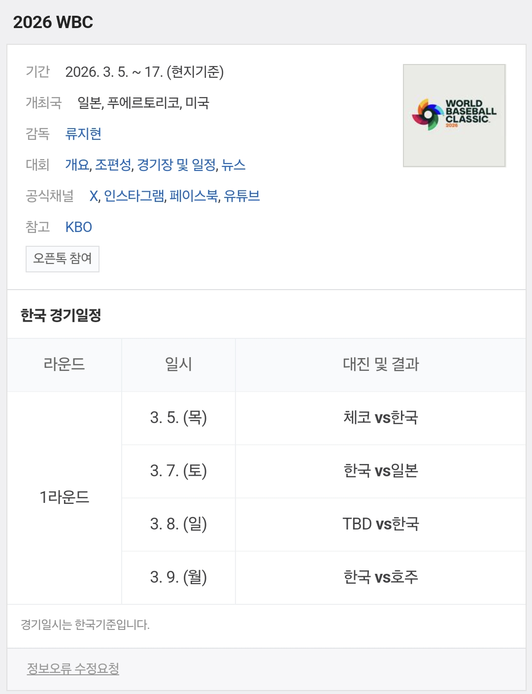 ⚾️ 2026 WBC (월드 베이스볼 클래식)
