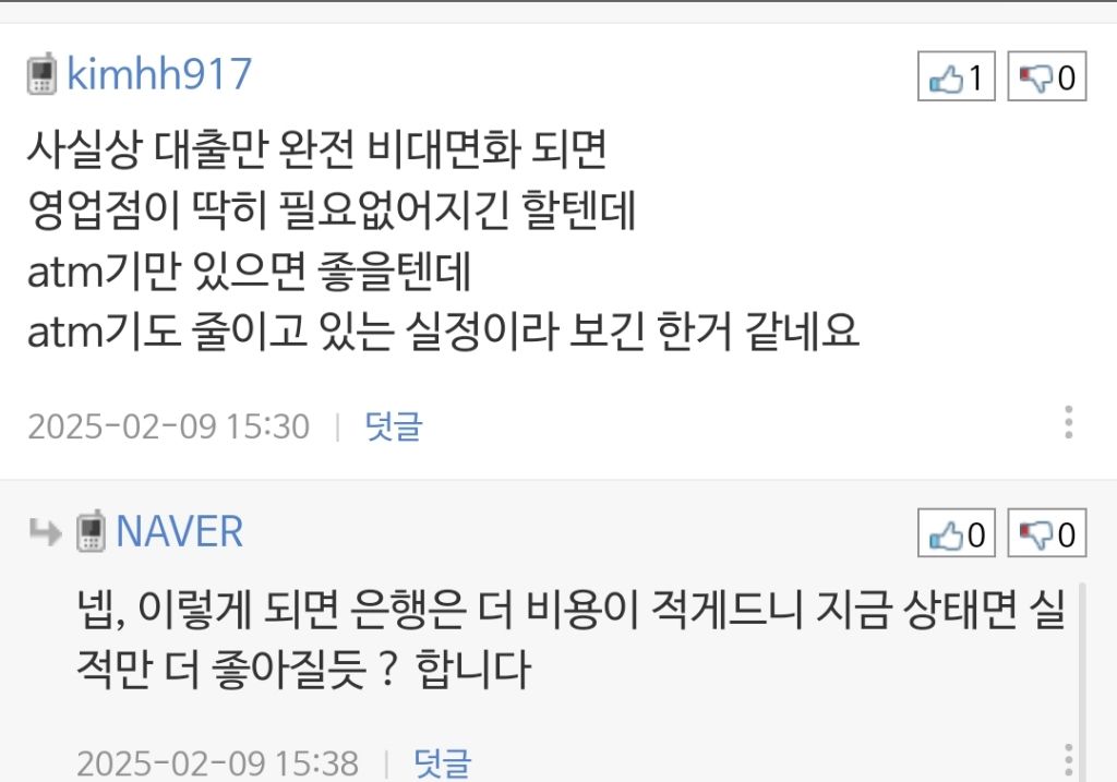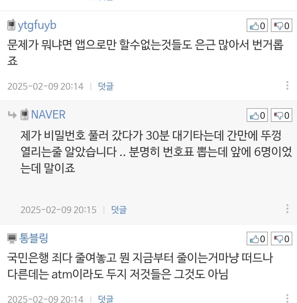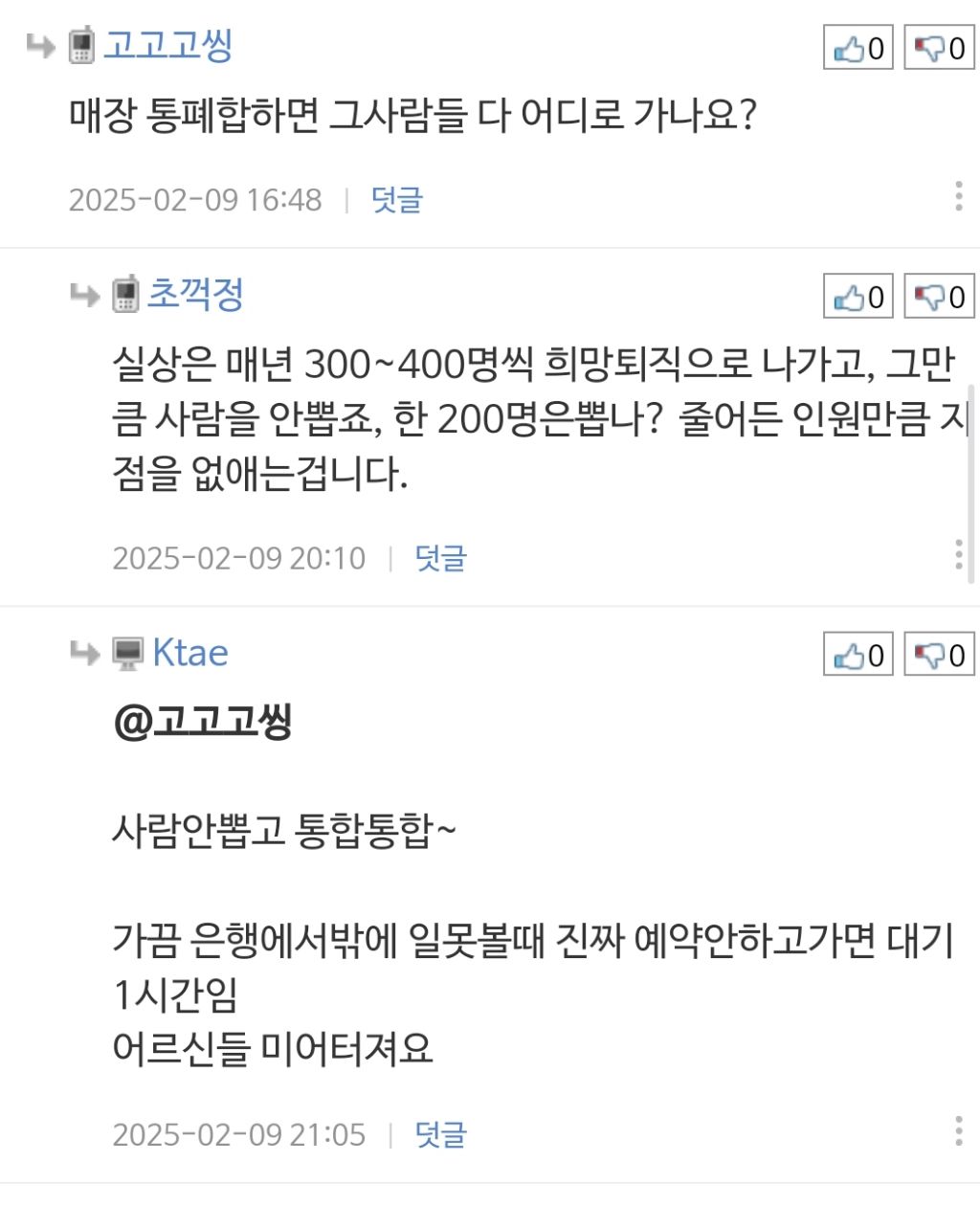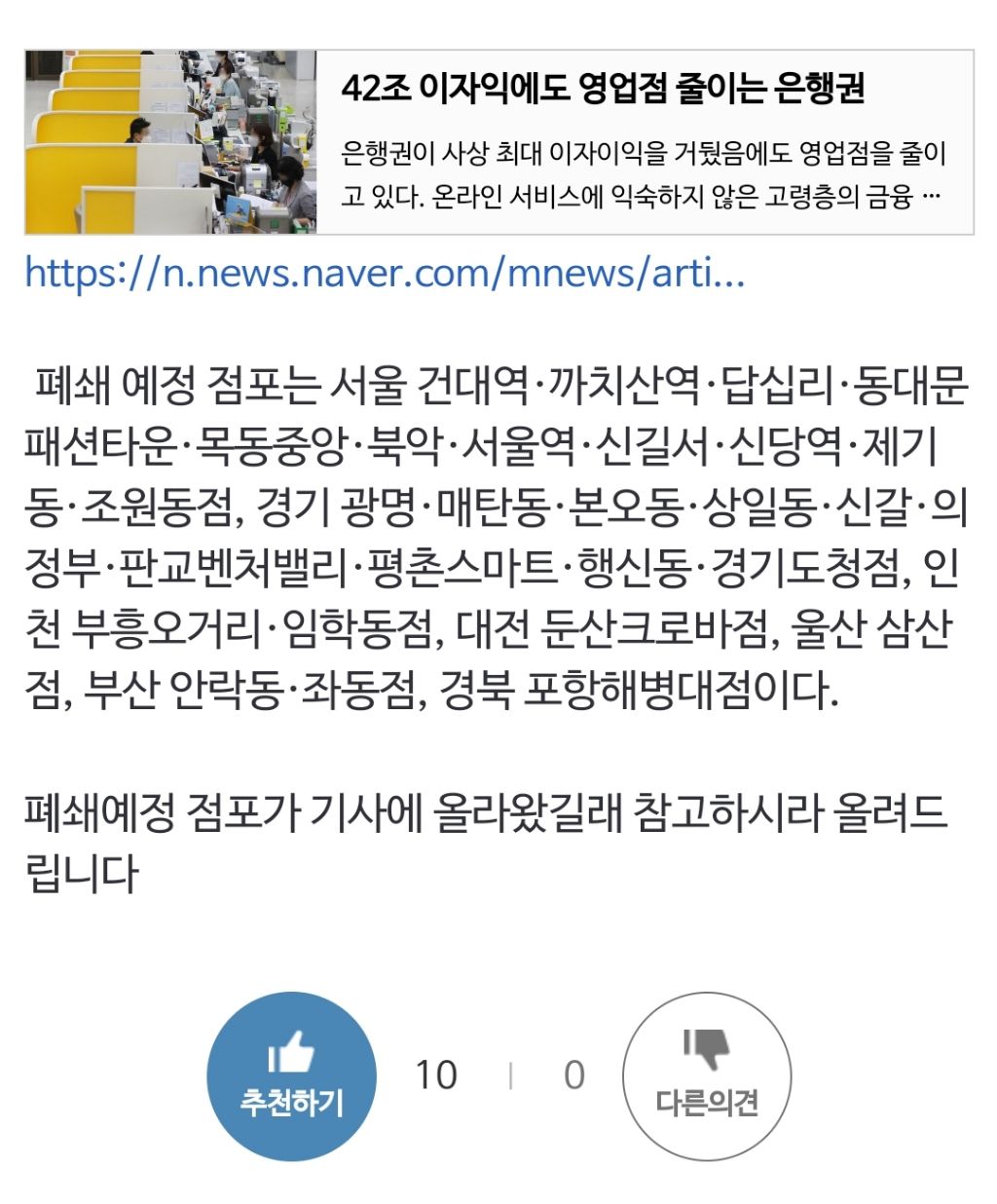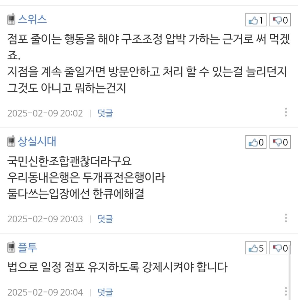 [흥미돋]내달 영업 점포 줄인다는 KB국민은행 작성자죠캎쎄오|작성시간25.02.09|조회수8,768 목록 댓글 29 글자크기 작게가 글자크기 크게가 출처: https://m.ppomppu.co.kr/new/bbs_view.php?id=money&no=520456 다음검색 현재 게시글 추가 기능 열기 북마크 공유하기 신고 센터로 신고 댓글 댓글 29 댓글쓰기 답글쓰기 댓글 리스트 작성자데참사 | 작성시간 25.02.10 어르신들은 어카라고 새끼들아 작성자08:20 | 작성시간 25.02.10 돈도 쳐잘벌면서 점포줄이는거 개킹받네 작성자당신의샛별 | 작성시간 25.02.10 울동네도 통폐합한다고 통보옴 ㅠ 작성자카페오레글라쎄 | 작성시간 25.02.10 어른들은 어케… 작성자파세코2 | 작성시간 25.02.10 우리동네도...........근데 3분거리에 두개 있어서 문제긴했는데...........그래도ㅜ국민은행자체가 사람넘많아서ㅜㅜㅜㅜㅜㅜㅜ두개있어야되는데ㅜㅜㅜ 댓글 전체보기
