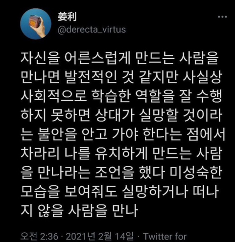 [스크랩] [흥미돋]나를 어른스럽게 만드는 사람을 만나지 말라는 말 공감하는지 달글 작성자수부지|작성시간25.02.09|조회수7,701 목록 댓글 24 글자크기 작게가 글자크기 크게가 까글 작성 활중분란 조장, 마플되는 글 작성 금지🍕좋은글🍿웃긴글🍗대환영🍣 동의 하는지 안하는지?? 이유랑 같이 이야기해보장 다음검색 스크랩 원문 : *여성시대* 차분한 20대들의 알흠다운 공간 현재 게시글 추가 기능 열기 북마크 공유하기 신고 센터로 신고 댓글 댓글 24 댓글쓰기 답글쓰기 댓글 리스트 작성자Qwersw | 작성시간 25.02.10 핵 동의 작성자야간하고밤새기 | 작성시간 25.02.10 이거 엄마랑 딸의 관계도 해당될까? 엄마앞에선 진짜 애처럼 못굴고 어른스러운척 다 괜탆은척 아무일도없는척 나한테의지히라고 그렇게되는데.... 집이콩가루라 ㅋ 작성자마인드게임 | 작성시간 25.02.10 동이 작성자형나퇴사하고싶네 | 작성시간 25.02.10 동이 동삼 동오 애새끼같이 만들어야됨 작성자호럴롤로랄 | 작성시간 25.02.10 완전동의 댓글 전체보기