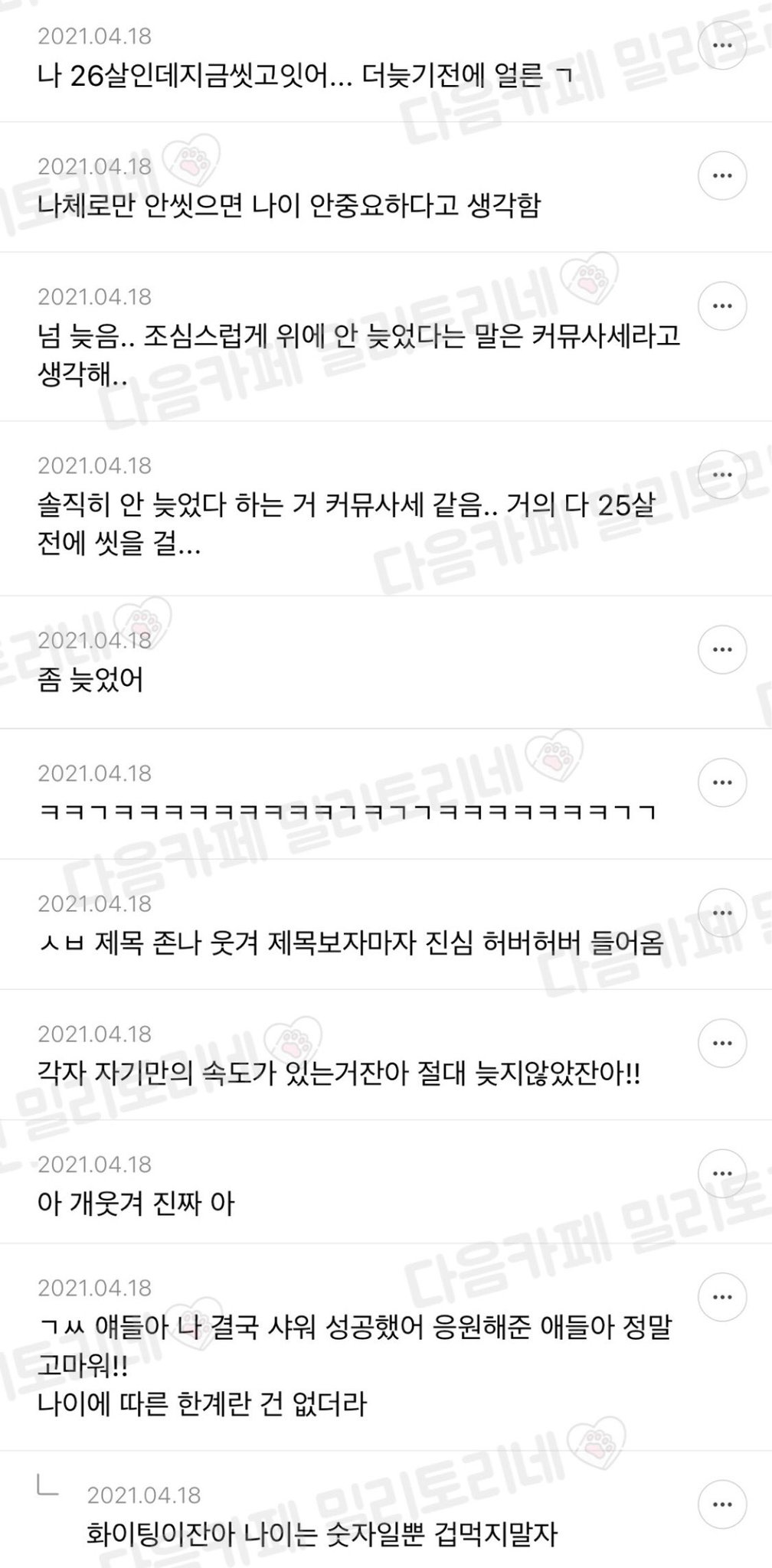 [스크랩] [흥미돋]나 25살인데 지금 씻으면 늦은걸까? 작성자이성계|작성시간25.02.09|조회수16,643 목록 댓글 40 글자크기 작게가 글자크기 크게가 출처: https://x.com/milytoryfan/status/1386150795402383365?s=46&t=v7QMmEln8v7WsADFKYn65gX의 밀리토리네 팬계정님(@milytoryfan)나 25살인데 지금 씻으면 늦은걸까?twitter.com 다음검색 스크랩 원문 : *여성시대* 차분한 20대들의 알흠다운 공간 현재 게시글 추가 기능 열기 북마크 공유하기 신고 센터로 신고 댓글 댓글 40 댓글쓰기 답글쓰기 댓글 리스트 작성자노 아 | 작성시간 25.02.10 여태 안씻고 뭐했어;;; 작성자Dita Von Teese | 작성시간 25.02.10 ㅋㅋㅋㅋㅋㅋㅋㅋㅋㅋ너무좋아 작성자pupu | 작성시간 25.02.10 나이때문에 못하는건 키즈모델밖에 없댔어 작성자굽시늬우스의 띠 | 작성시간 25.02.10 휴... 진짜 죽기 전까지는 못하는건 없음 그냥 어려울뿐 작성자월급더줘요 | 작성시간 25.02.10 ㅠㅠ서른다섯 아직도 안씻었는데 용기얻고가! 댓글 전체보기
