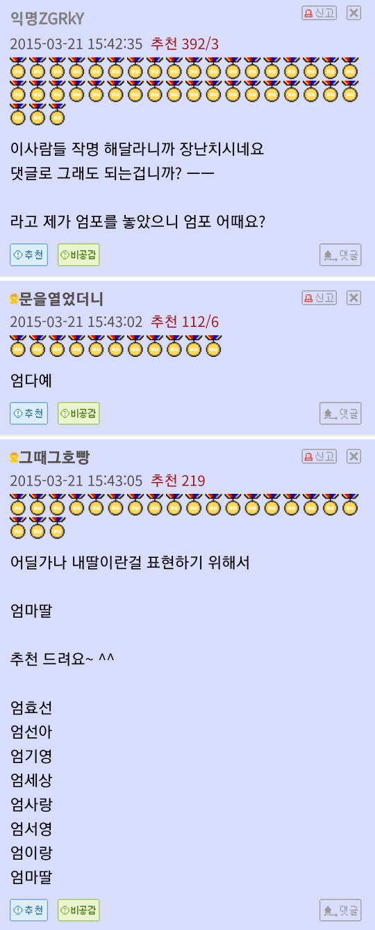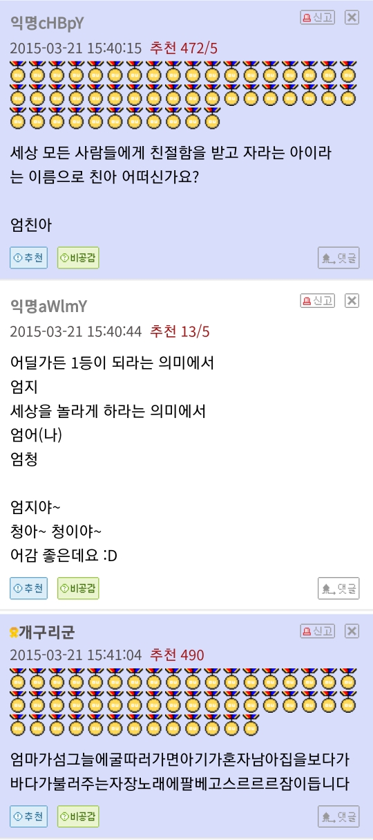 [흥미돋]엄씨인데 딸 이름 추천 좀 작성자에트와르|작성시간25.02.12|조회수10,211 목록 댓글 59 글자크기 작게가 글자크기 크게가 출처: https://www.dogdrip.net/486779796 다음검색 현재 게시글 추가 기능 열기 북마크 공유하기 신고 센터로 신고 댓글 댓글 59 댓글쓰기 답글쓰기 댓글 리스트 작성자얼음빙전문가 | 작성시간 25.02.12 연희!! 작성자내딸김사월 | 작성시간 25.02.12 엄브릿지! 작성자남남수수학학원원장장남남남국 | 작성시간 25.02.12 엄마하~이름만 불러도호~~ 작성자귀여운글에댓달고우는여시 | 작성시간 25.02.12 엄마!!어디야!!!!!!!??왜 집에 없어????! 작성자열라면악개 | 작성시간 25.02.12 엄여수 댓글 전체보기