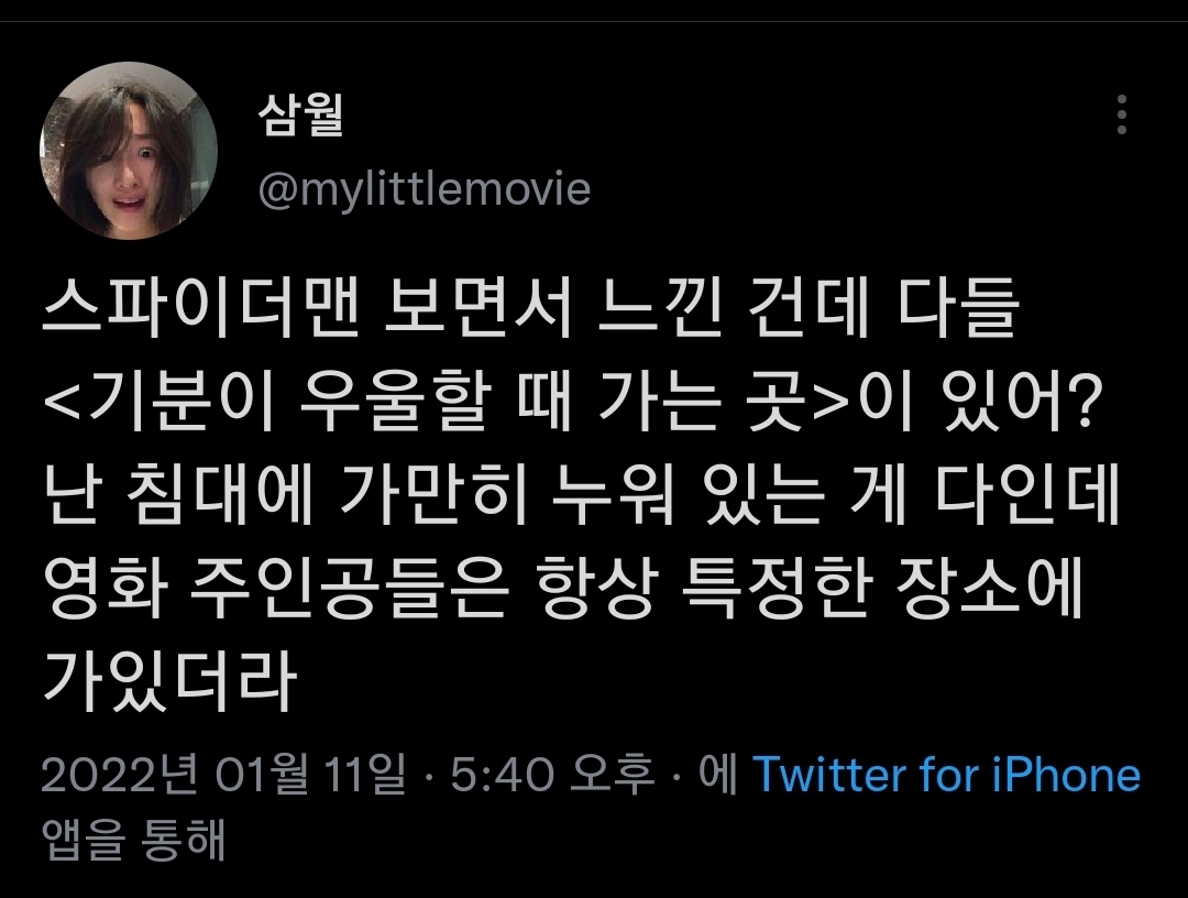 [스크랩] [흥미돋]스파이더맨 보면서 느낀건데 다들 <기분이 우울할 때 가는 곳>이 있어? 작성자NJNZ|작성시간25.02.12|조회수4,978 목록 댓글 53 글자크기 작게가 글자크기 크게가 출처 : https://twitter.com/mylittlemovie/status/1480821824502263809?t=d5y4e6NISTPikJvER0wqjg&s=19삼월 on Twitter“스파이더맨 보면서 느낀 건데 다들 <기분이 우울할 때 가는 곳>이 있어? 난 침대에 가만히 누워 있는 게 다인데 영화 주인공들은 항상 특정한 장소에 가있더라”twitter.com나는 혼자서 카페감ㅎㅎ 단 바깥풍경이 잘 보이고 해가 많이 들어오는 곳으로 다음검색 스크랩 원문 : *여성시대* 차분한 20대들의 알흠다운 공간 현재 게시글 추가 기능 열기 북마크 공유하기 신고 센터로 신고 댓글 댓글 53 댓글쓰기 답글쓰기 댓글 리스트 작성자나만의관객 | 작성시간 25.02.12 집 침대 작성자슬로운 | 작성시간 25.02.12 집 앞 공원 작성자없어져라.너말이야 | 작성시간 25.02.12 나는 있음..거기 가면 동대문쪽 시내가 한눈에 싹 들어와서 가슴이 뚫리는 느낌나고 좋아 작성자미묘해 | 작성시간 25.02.12 사이버 세계로.. 이미지 확대 작성자love you guys! | 작성시간 25.02.20 책상 밑… 애기때부터 버릇이 지금까지 가는 거 같아 댓글 전체보기