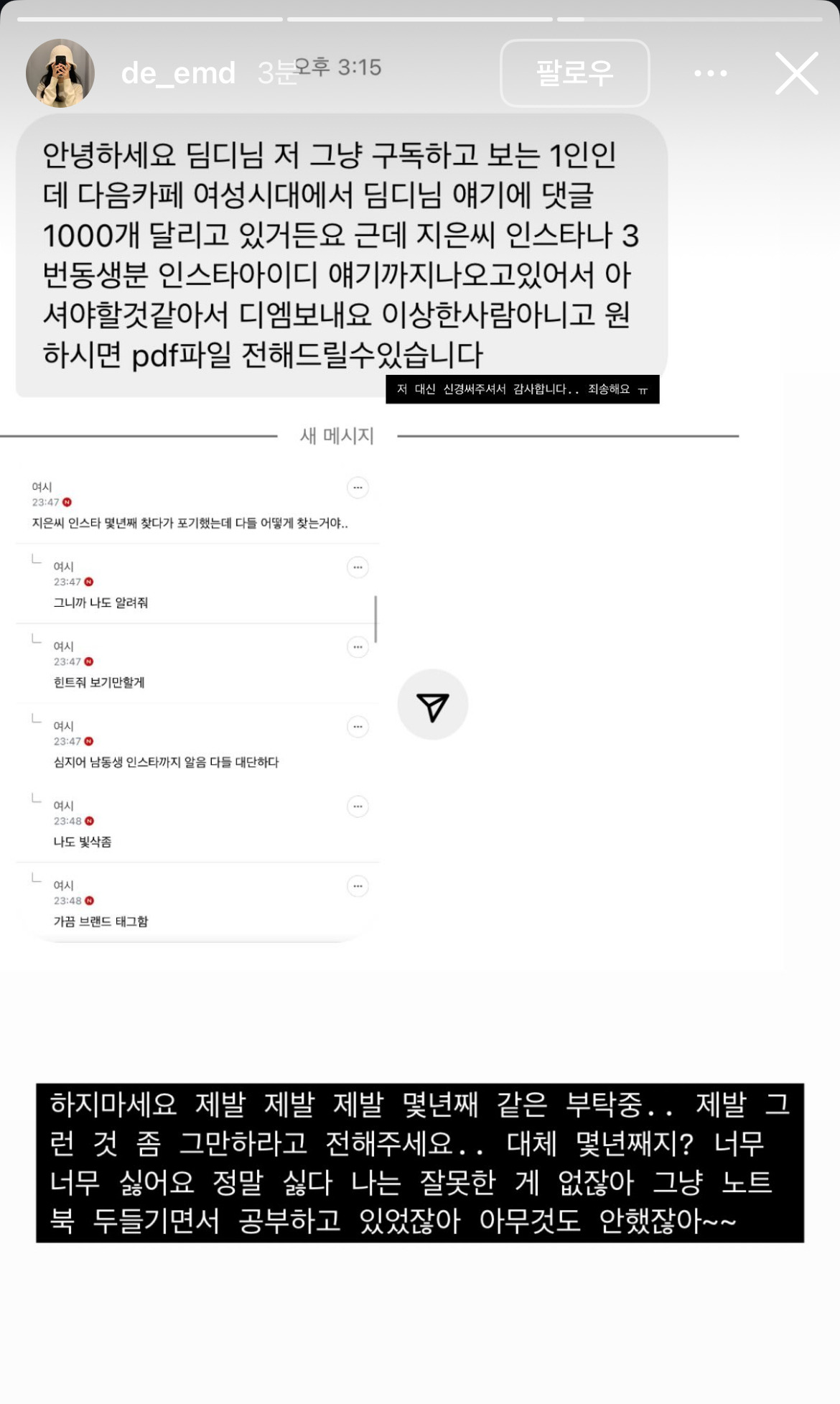 [흥미돋]유튜버 딤디 인스스 (여성시대 언급) 작성자nero|작성시간25.02.12|조회수102,209 목록 댓글 435 글자크기 작게가 글자크기 크게가 출처: 여성시대 nero여시들아 제발 좀 ㅅ발 다음검색 현재 게시글 추가 기능 열기 북마크 공유하기 신고 센터로 신고 댓글 댓글 435 댓글쓰기 답글쓰기 댓글 리스트 작성자마뗑킴 | 작성시간 25.02.12 ㅈㄴ한심하다 진짜 왜 저러고 살지.. 작성자쿨피스자두 | 작성시간 25.02.13 진짜 정병 레전드.. 할짓이 얼마나 없으면; 열폭 추해 작성자축축틴루터 | 작성시간 25.02.13 제발좀....제발 작성자fresh celebration | 작성시간 25.02.14 근데 저게 왜 궁금한건데..? 작성자목말라요요 | 작성시간 25.02.22 다 고소했으면 좋겠어 미친인간들 너무 많아 댓글 전체보기